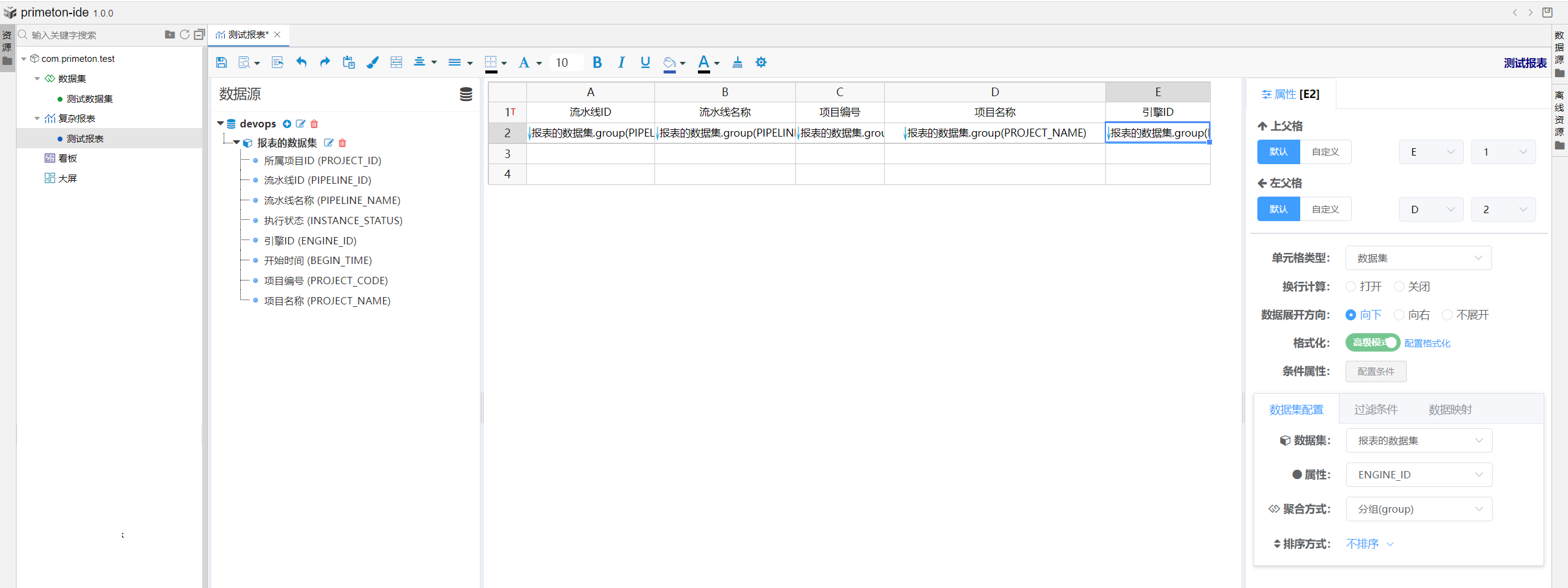 在新建的测试报表中,选择创建的数据源,填写其他相关信息,具体开发详解请参考复杂报表配置 (opens new window) 。