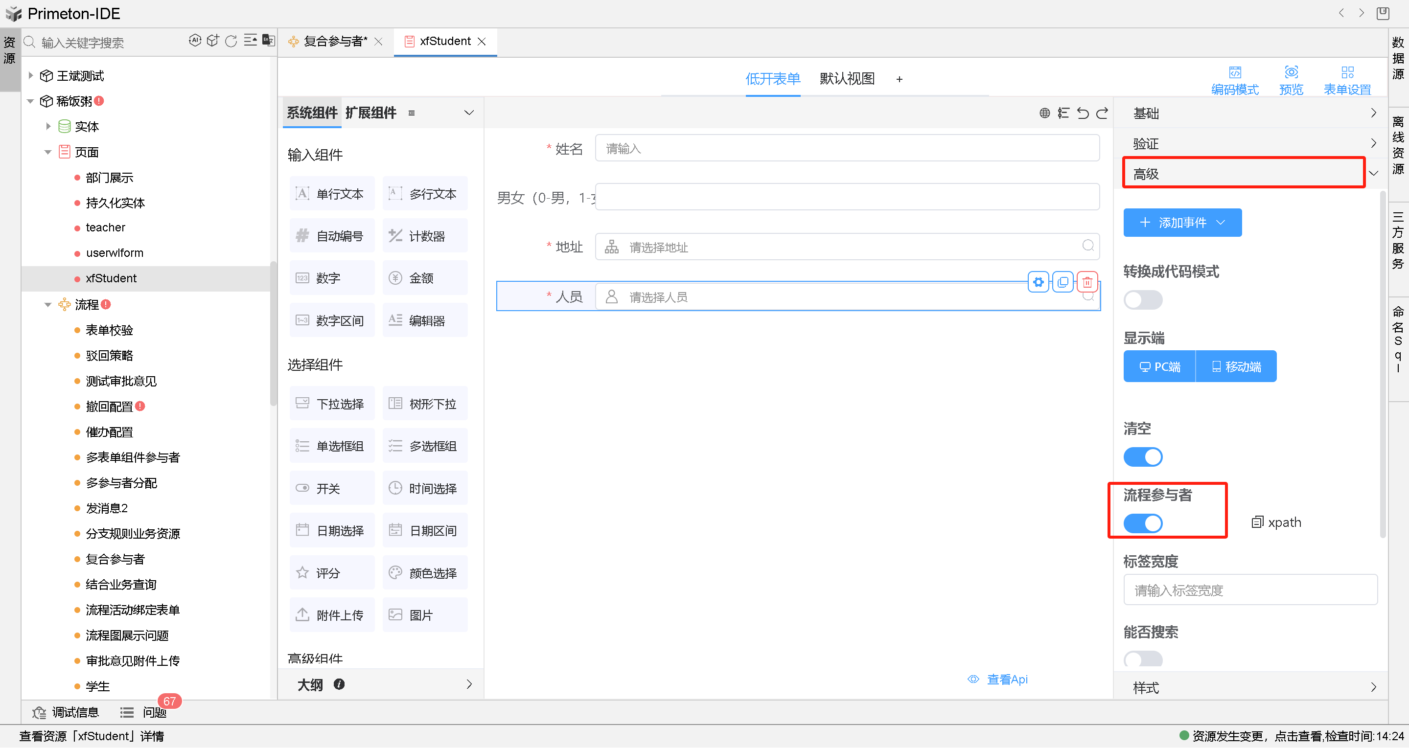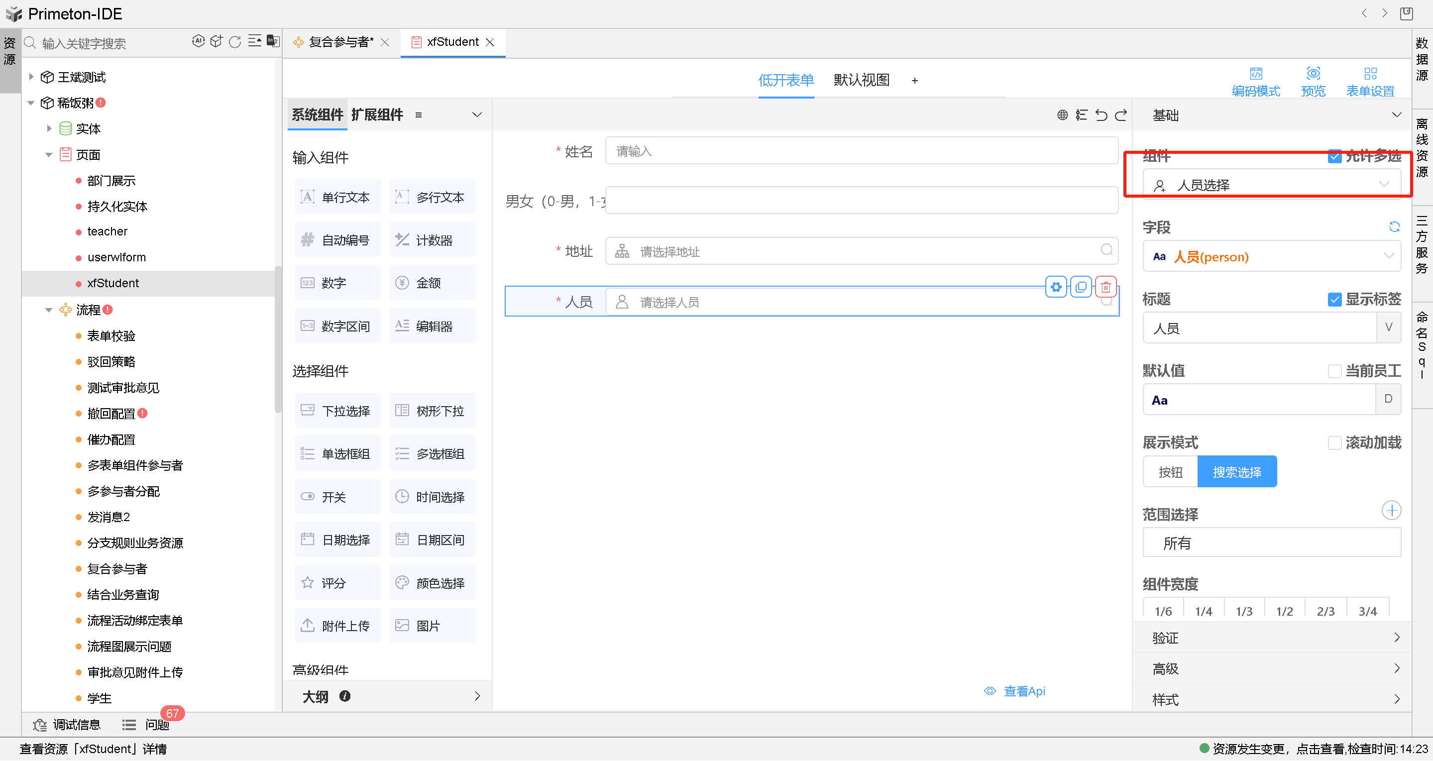 首先,先在表单设计页面,将对应参与者的属性字段的组件类型选择为人员选择组件