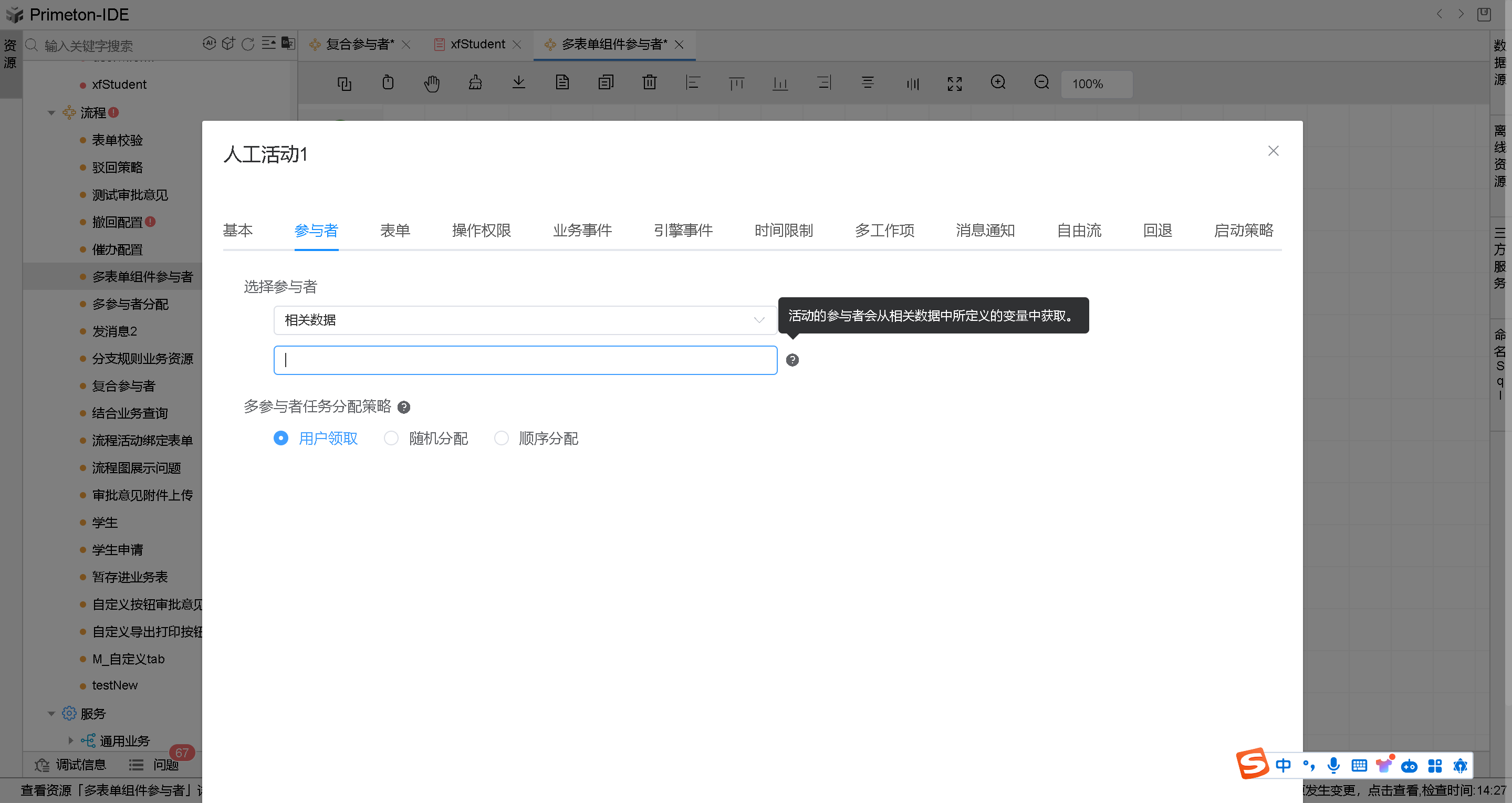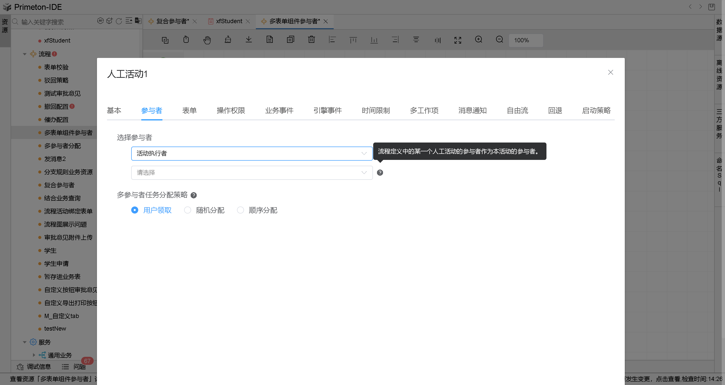 人工活动图元默认的参与者就是流程启动者,就是发起流程的人。例如:张三是某个流程的发起人,某个环节设置的参与者是流程启动者,则流程在流转到这个活动时,张三就是这个活动参与者。