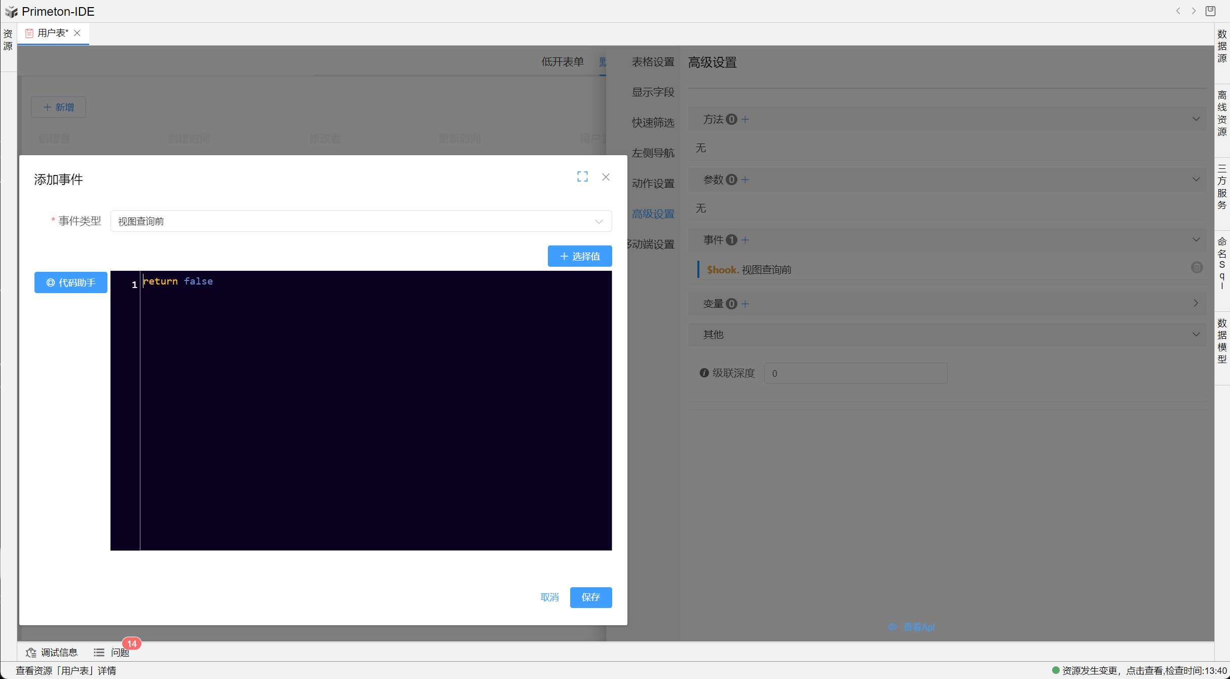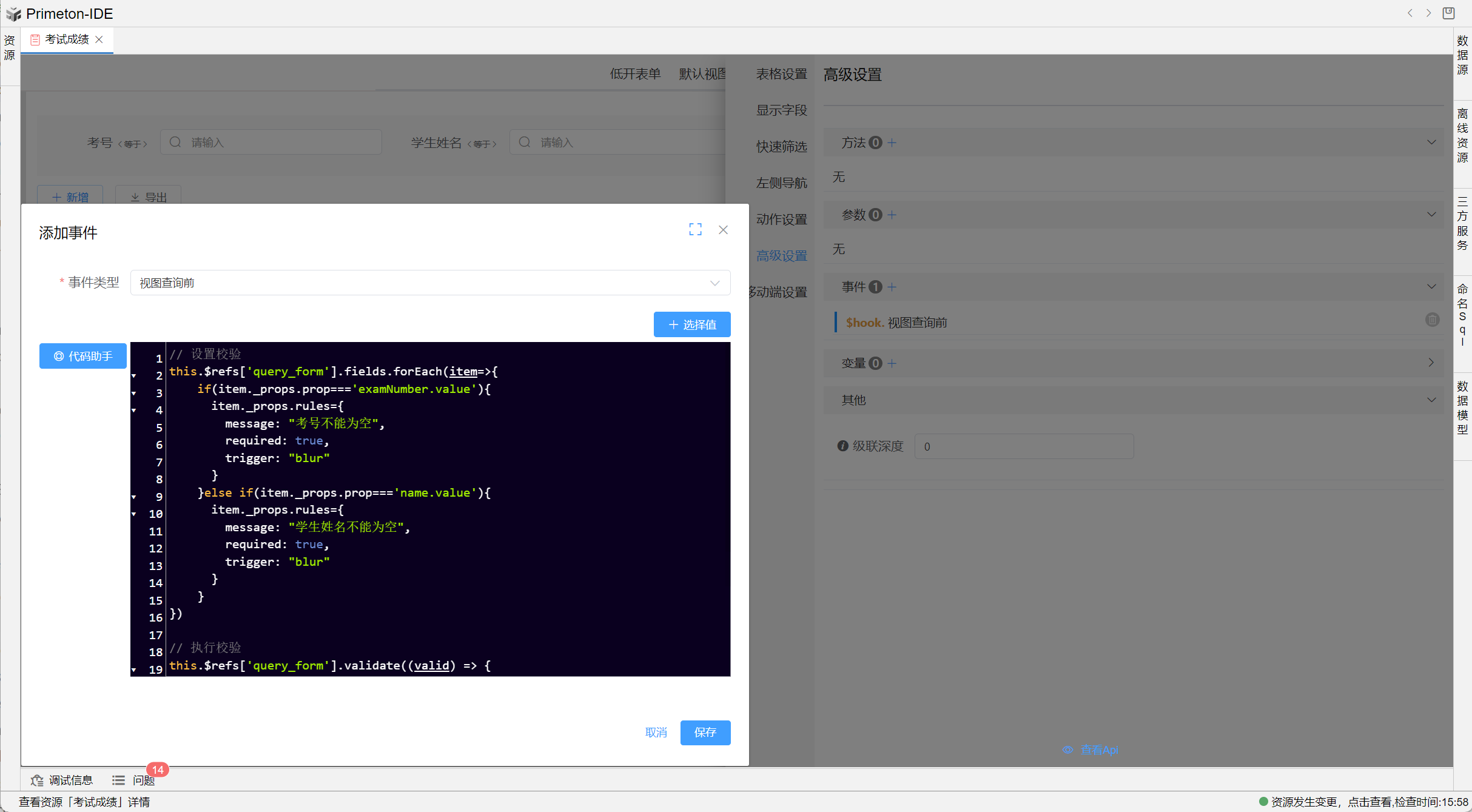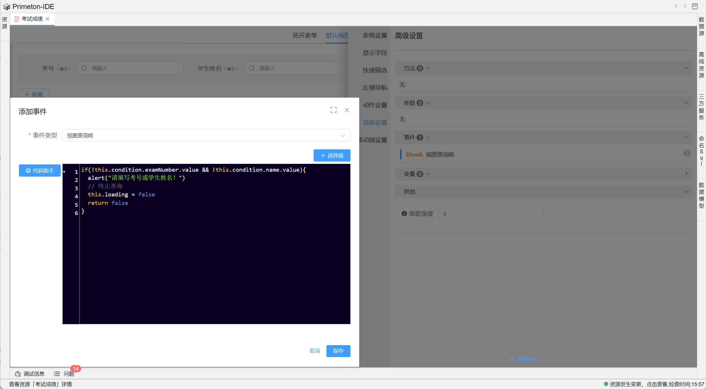 仅适用于PC端,具体操作在【视图设置>高级设置>事件>视图查询前】,配置如下: