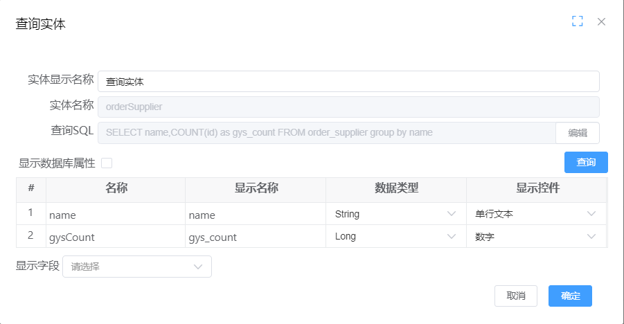 完成查询实体从orderSupplier表中按name字段对数据进行分组,并计算每类供应商的数量