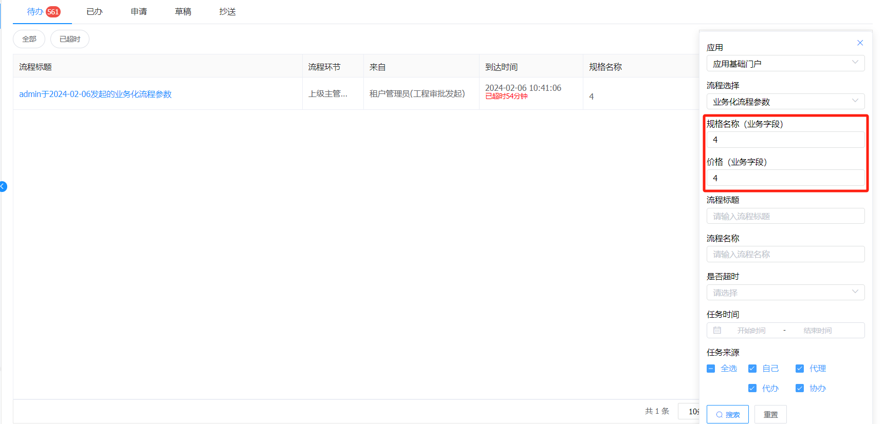 以下图工程审批流程为例,讲解如何在流程中心-》我的任务中根据"规格名称"及"价格"查询流程任务。