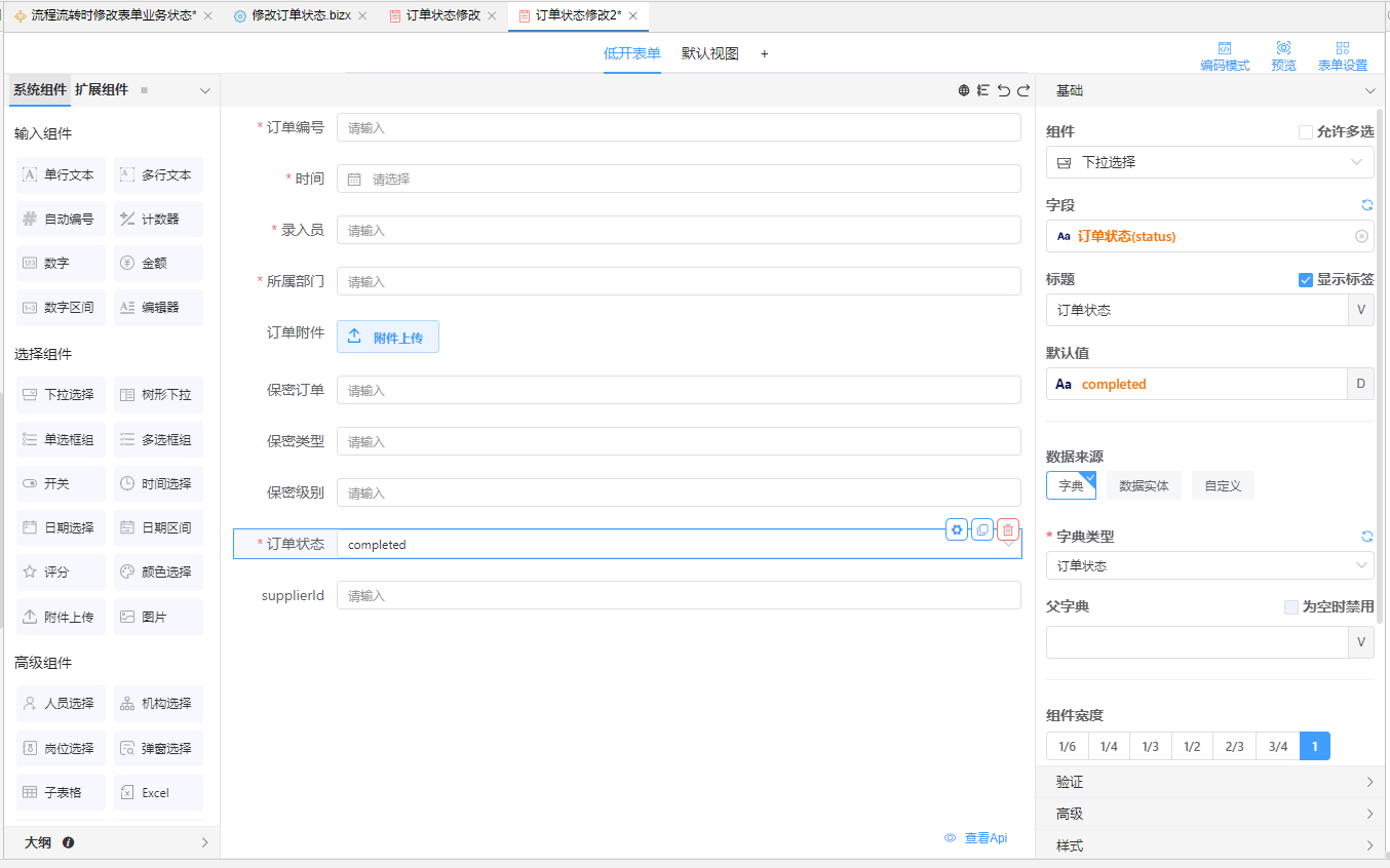 创建订单状态2表单后,拖选一个下拉控件绑定订单状态字段,并给下拉组件绑定业务字典。