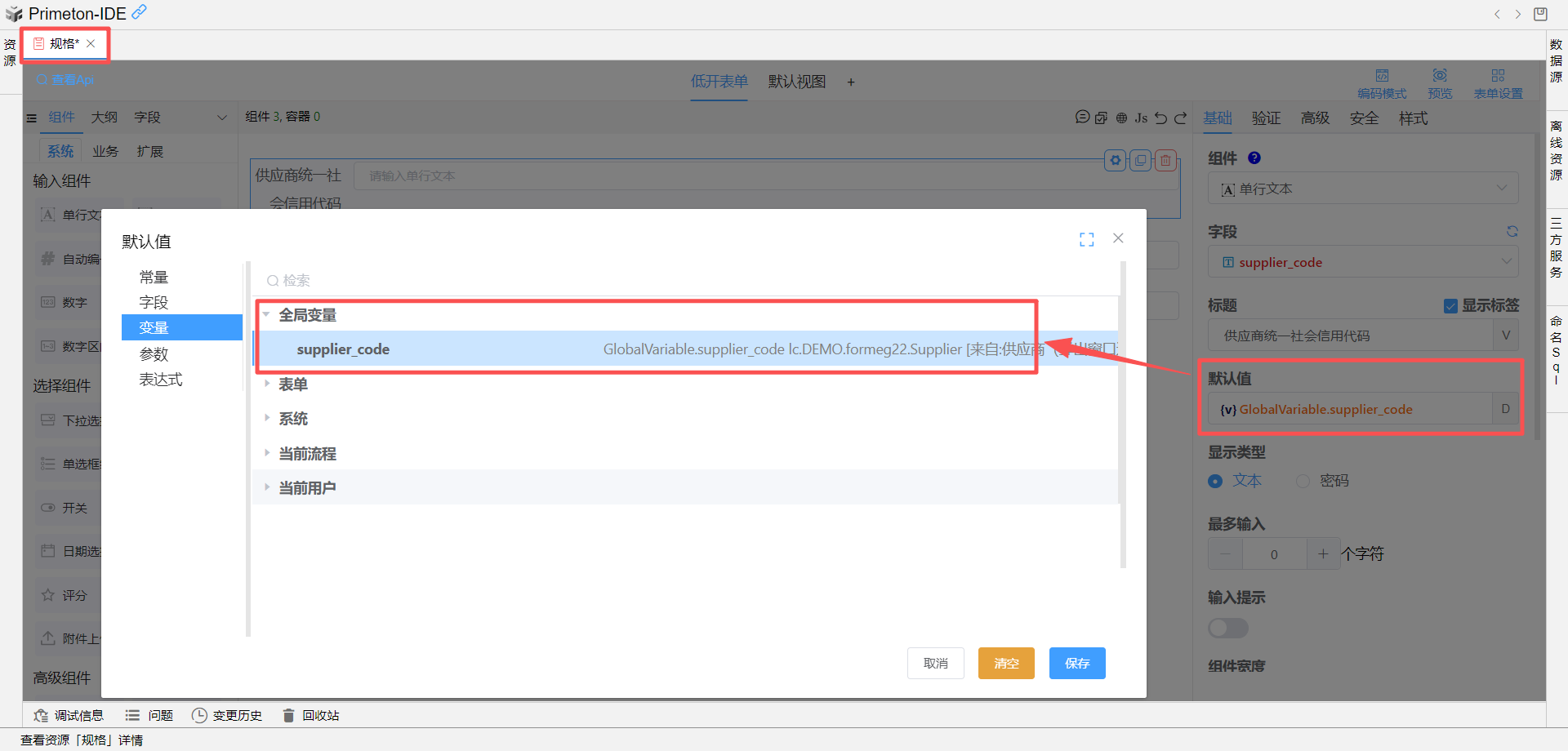 GlobalVariable.supplier_code设置为供应商统一社会信用代码组件的默认值![]()