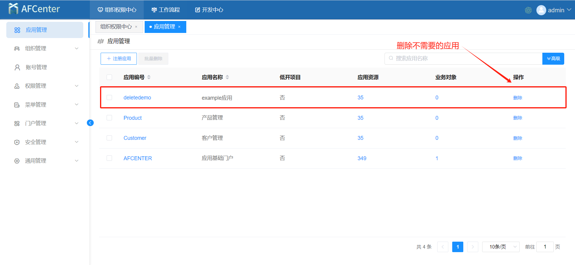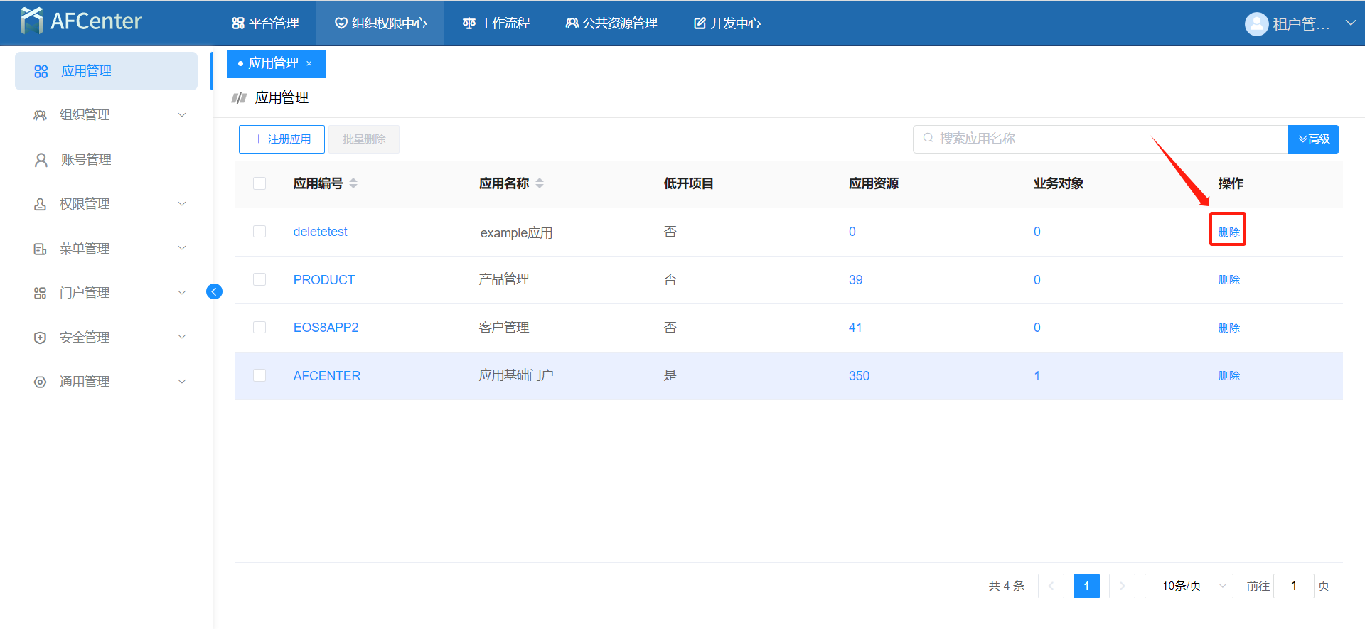 AFCenter里可以集成多个业务应用,有些业务应用不需要使用时,可能需要删除。