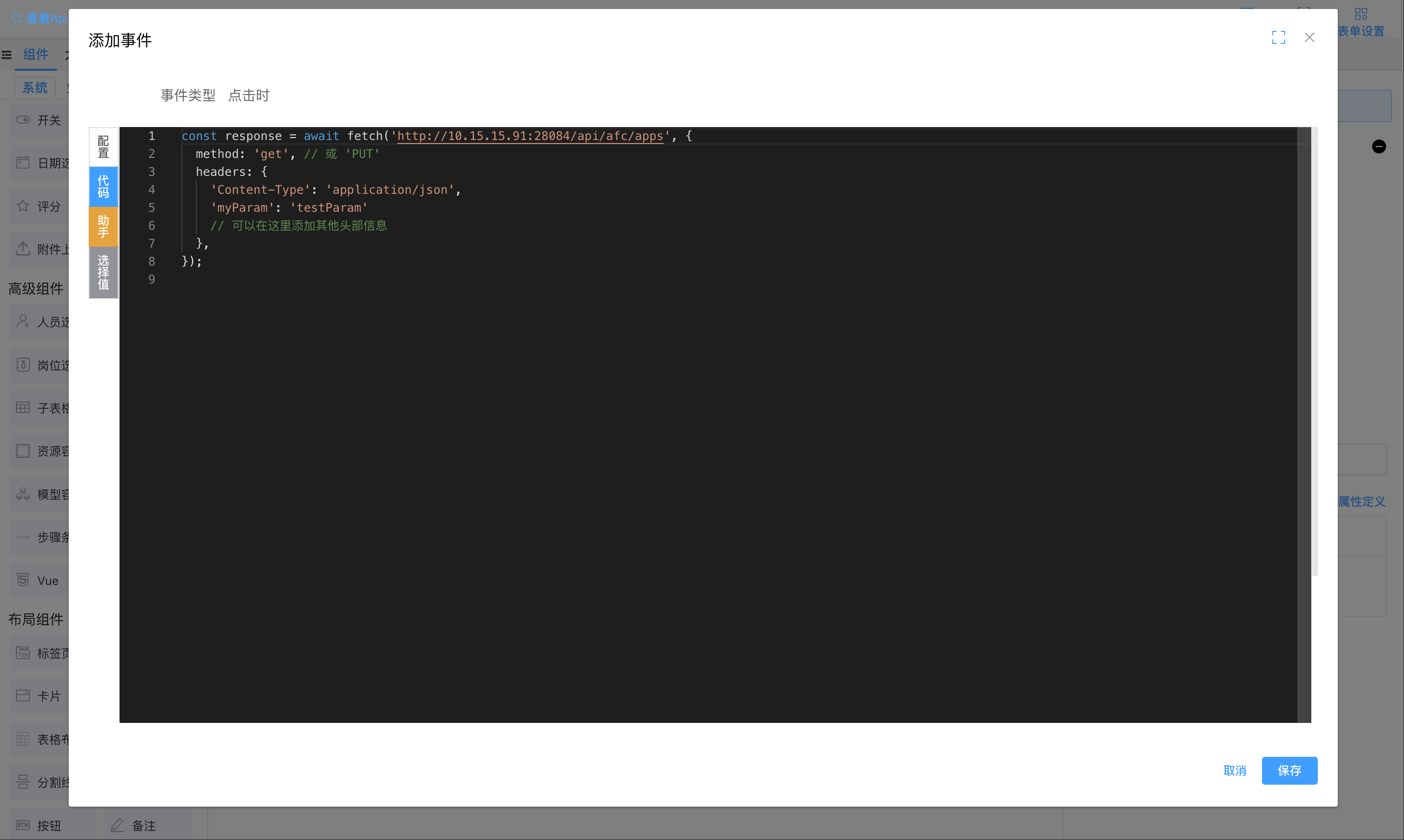 1.表单内拖选按钮组件,配置按钮组件的点击时事件,js代码如下: