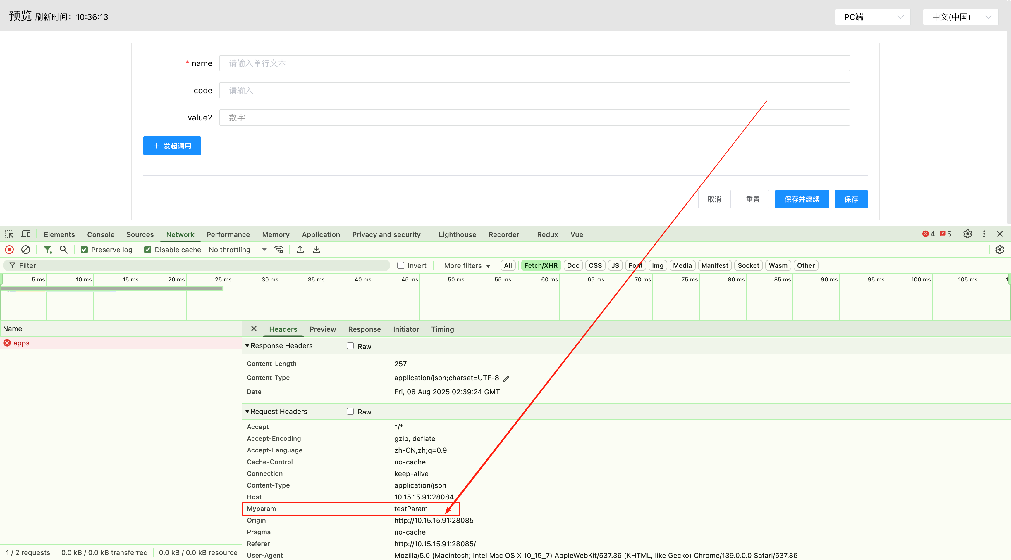 2.保存预览表单后,点击按钮触发事件,查看网络请求发送中的请求头中新的参数已添加。