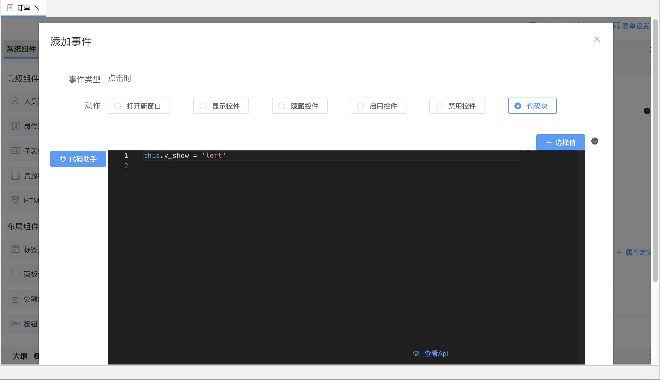 添加显示左侧按钮,并为其添加事件,将v_show赋值为'left'。