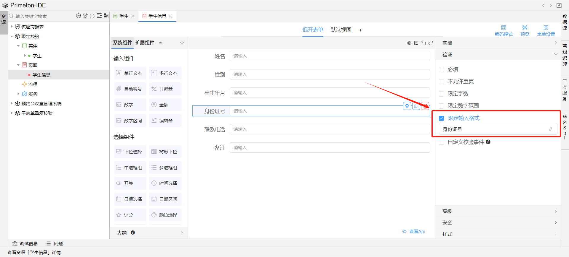 单行文本组件,点击右侧校验-限定输入格式-身份证号。