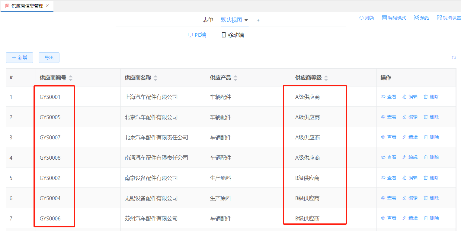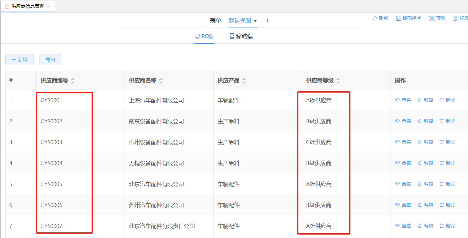 "供应商信息管理"存在多个字段,本文以先按照"供应商等级"升序排序,再按照"供应商编号"升序排序为例,讲解视图中表格根据多字段排序的实现。
