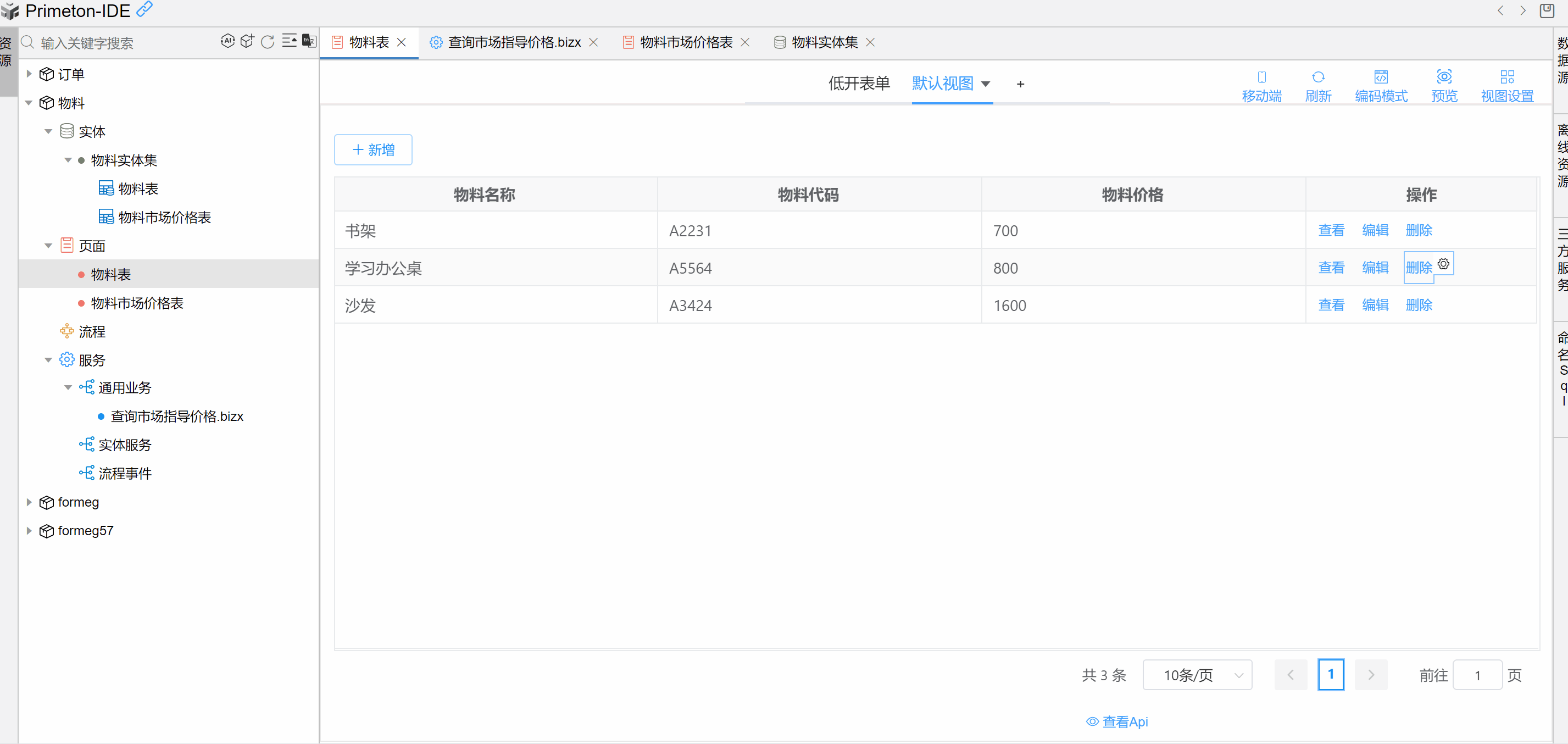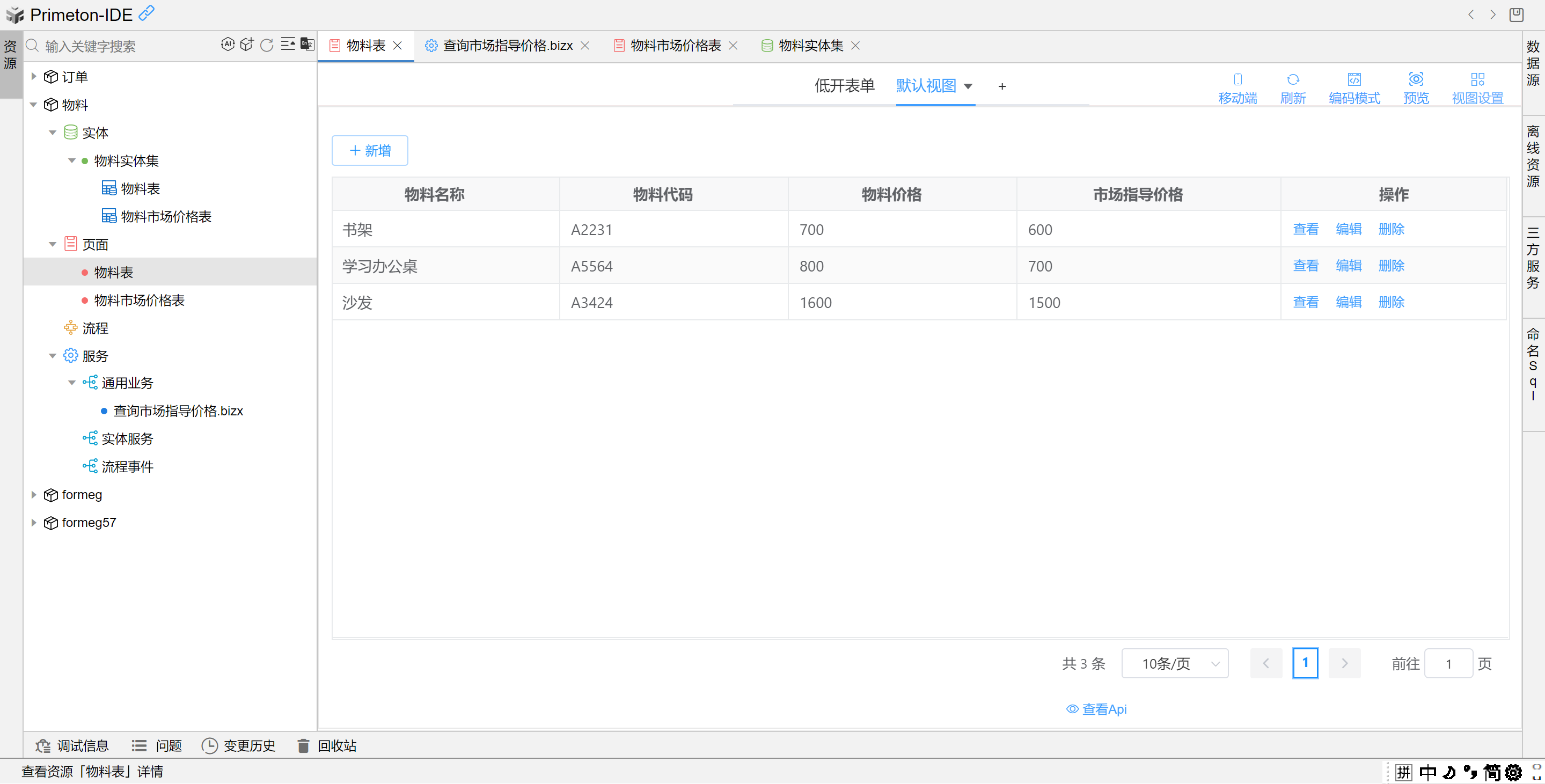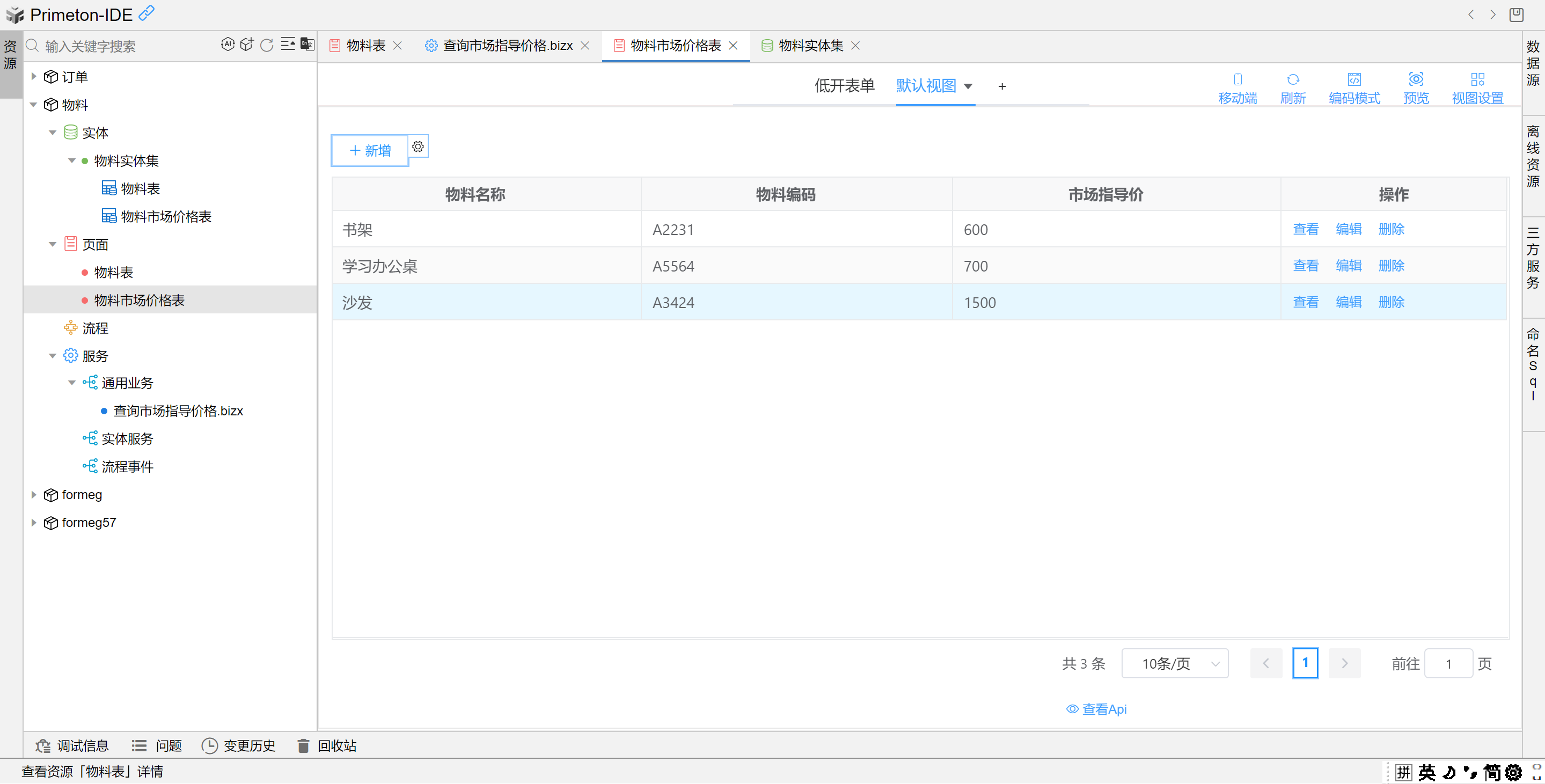 在服务-通用业务中新建服务,通过queryEntitiesByProperty获取物料市场指导价格: