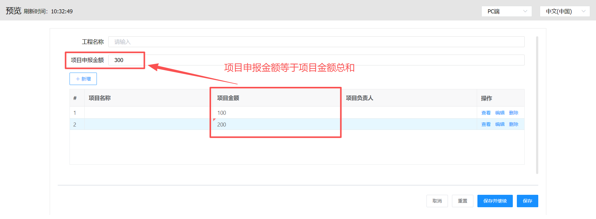 使用场景:工程表与工程项目表为1:n持久化实体模型关系,工程表表单中通过自定义按钮点击后新增工程项目表中的数据行,工程表中项目申报总金额会自动根据子表格中填写的每一个项目金额进行汇总显示出来。