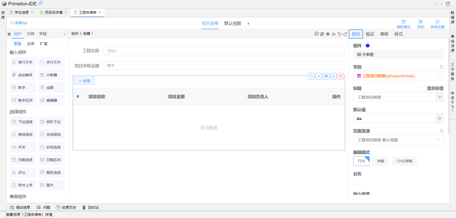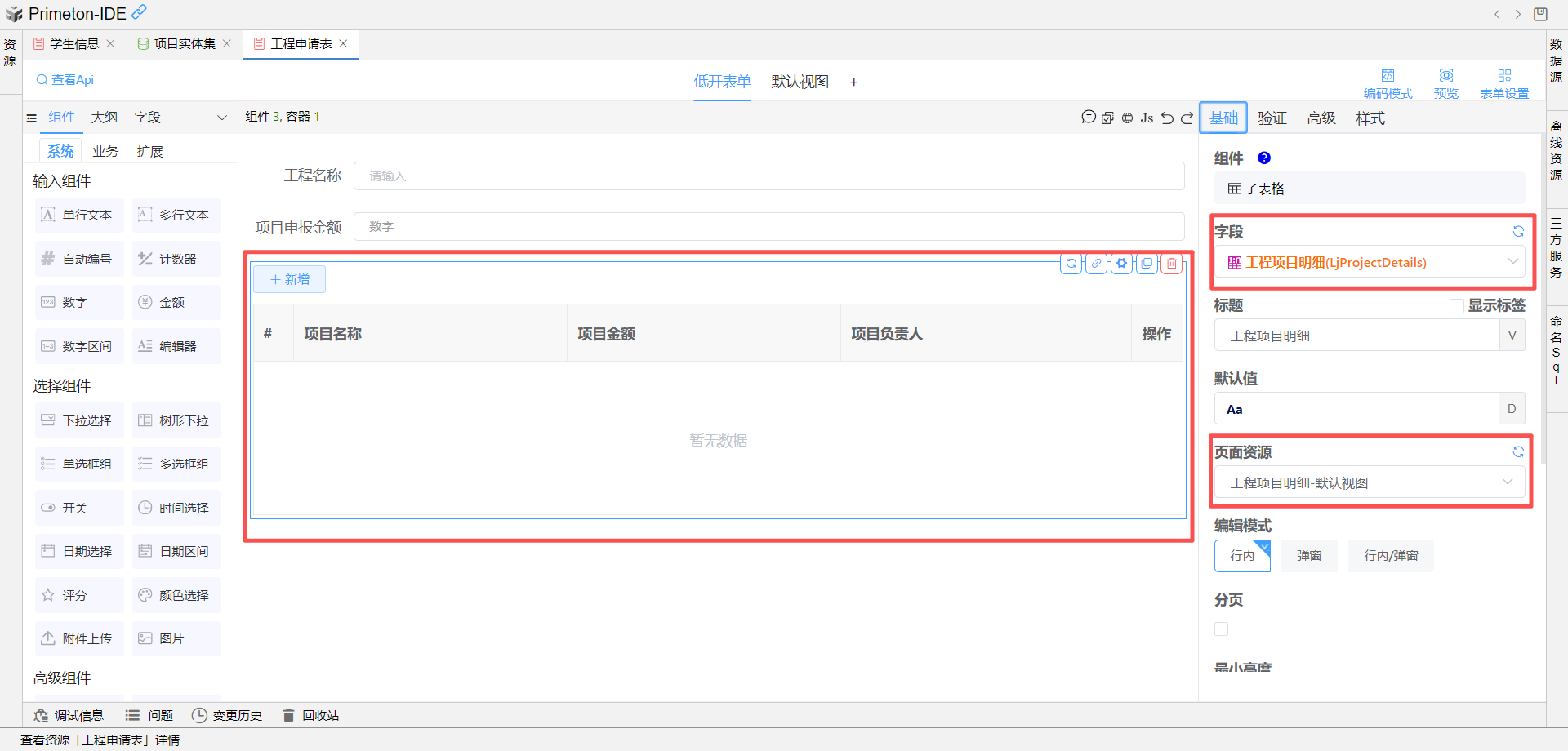 2.拖动子表格组件并绑定工程项目表,子表格绑定n端实体对象字段。