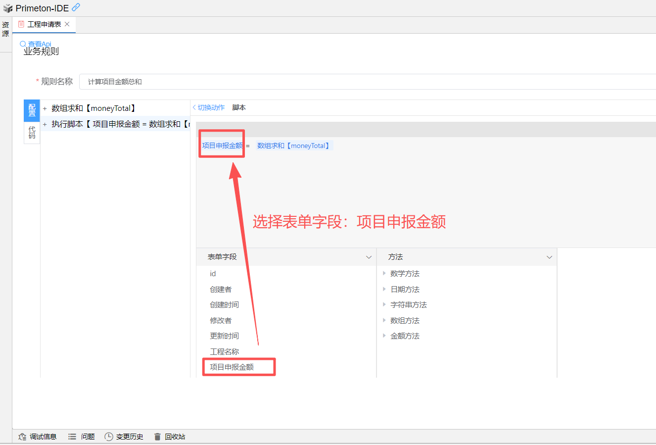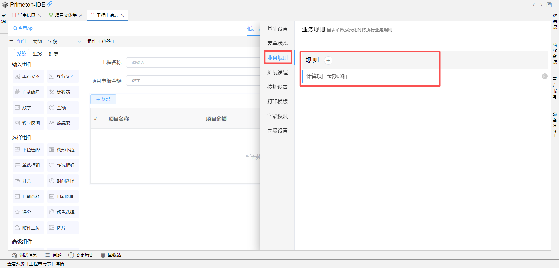 3.打开表单设置中业务规则,新建业务规则,输入名称-计算项目金额总和,在规则编辑器中根据下面步骤进行配置: