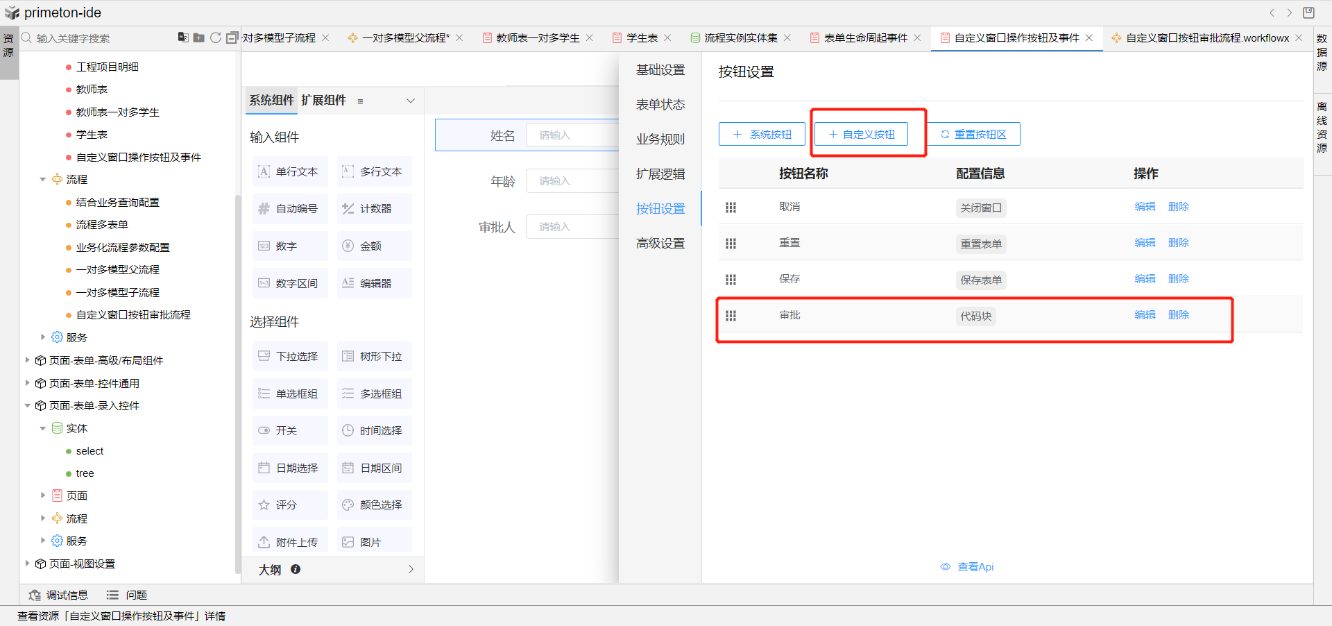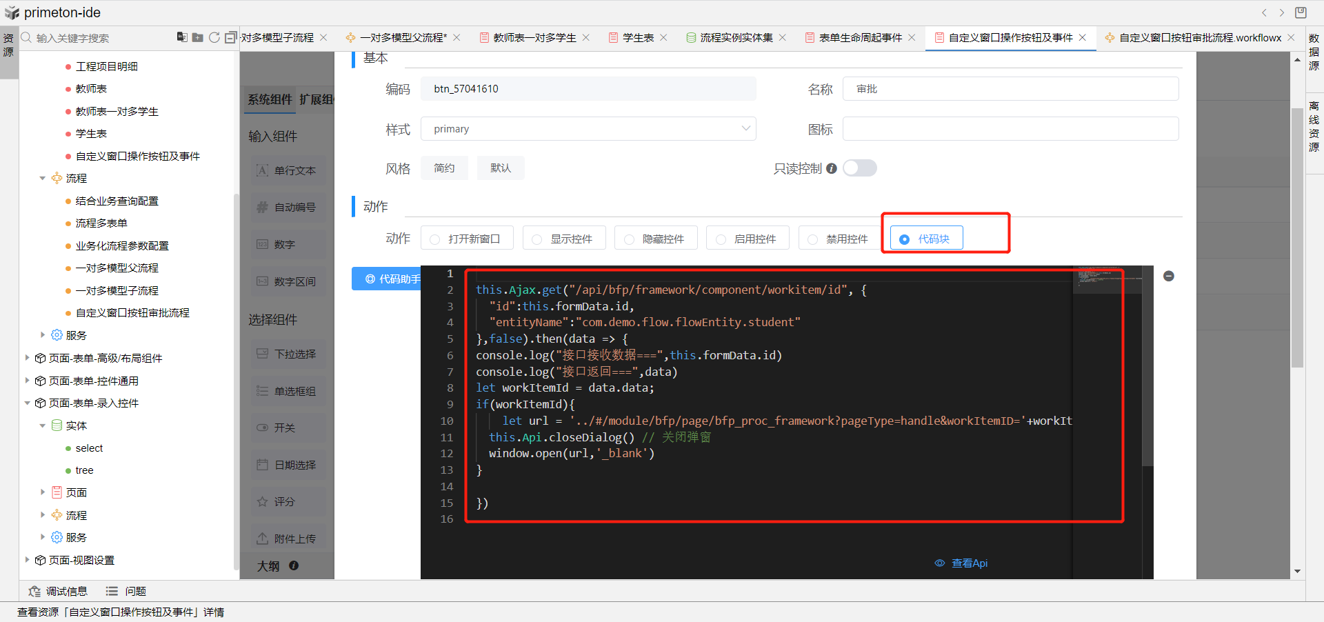2.点击表单设置,选择按钮设置,添加自定义按钮,修改名称为审批。在动作模块中勾选代码块,代码块中首先使用ajax调用根据当前表单数据业务主键id和实体名称查询当前工作项信息,然后再根据获取到的当前工作项id打开流程审批页面即可。