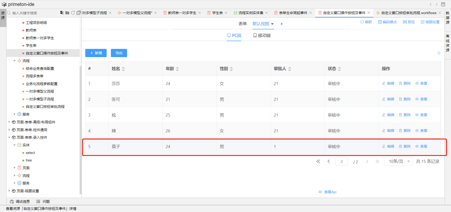 1.根据实体创建我们用于流程发起的表单,创建表单提交前事件,设置人员状态默认为审核中。