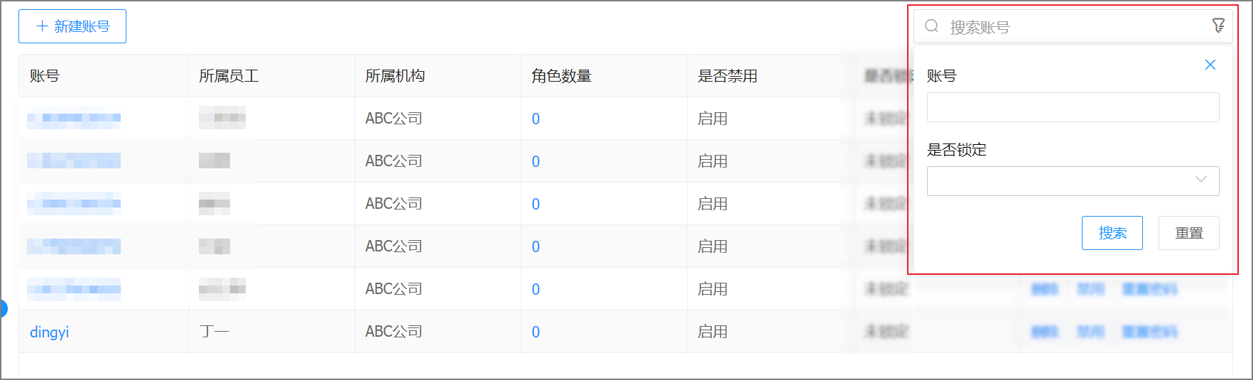 可以使用高级搜索,通过账号、是否锁定快速查询已有账号。