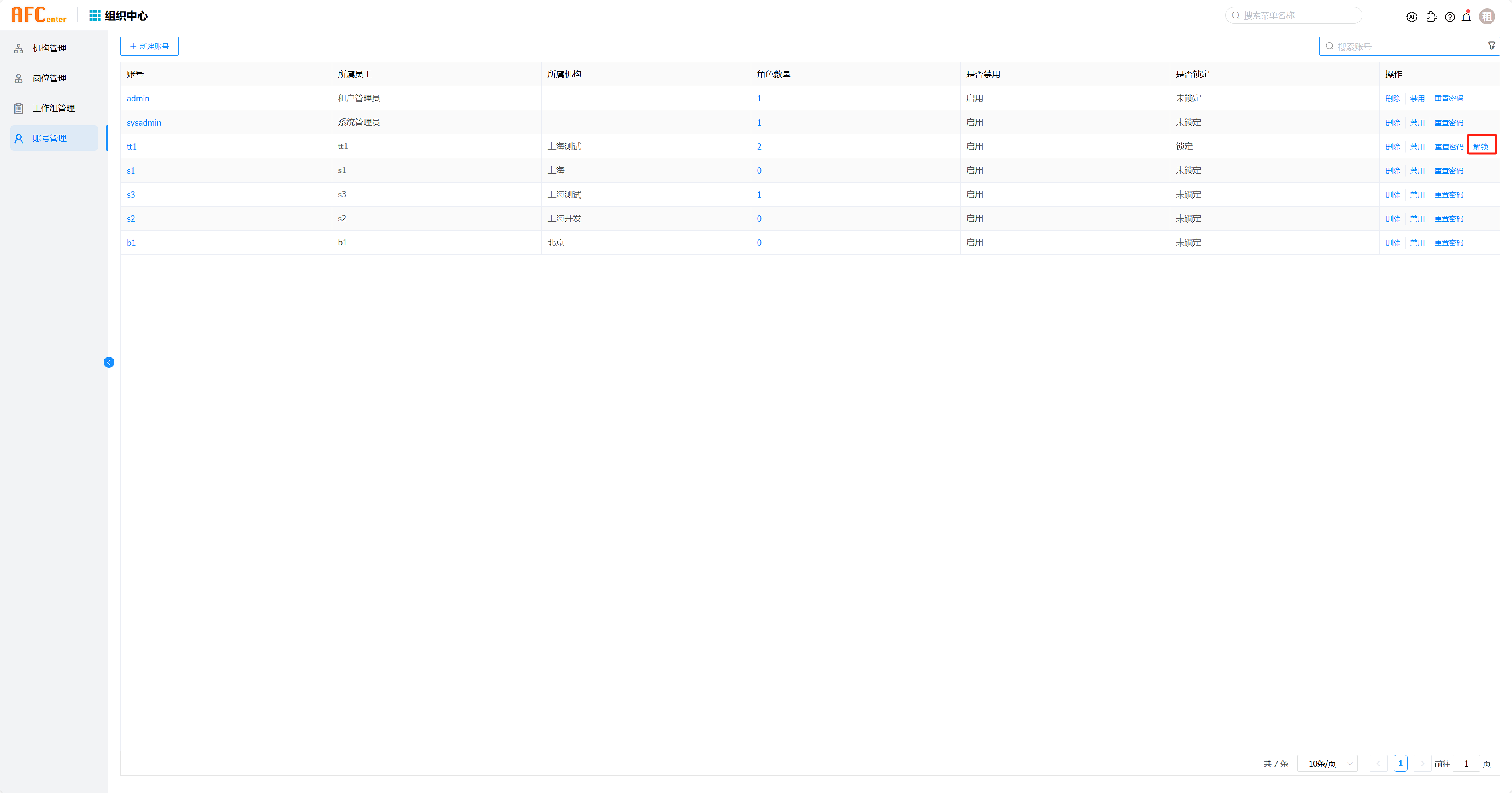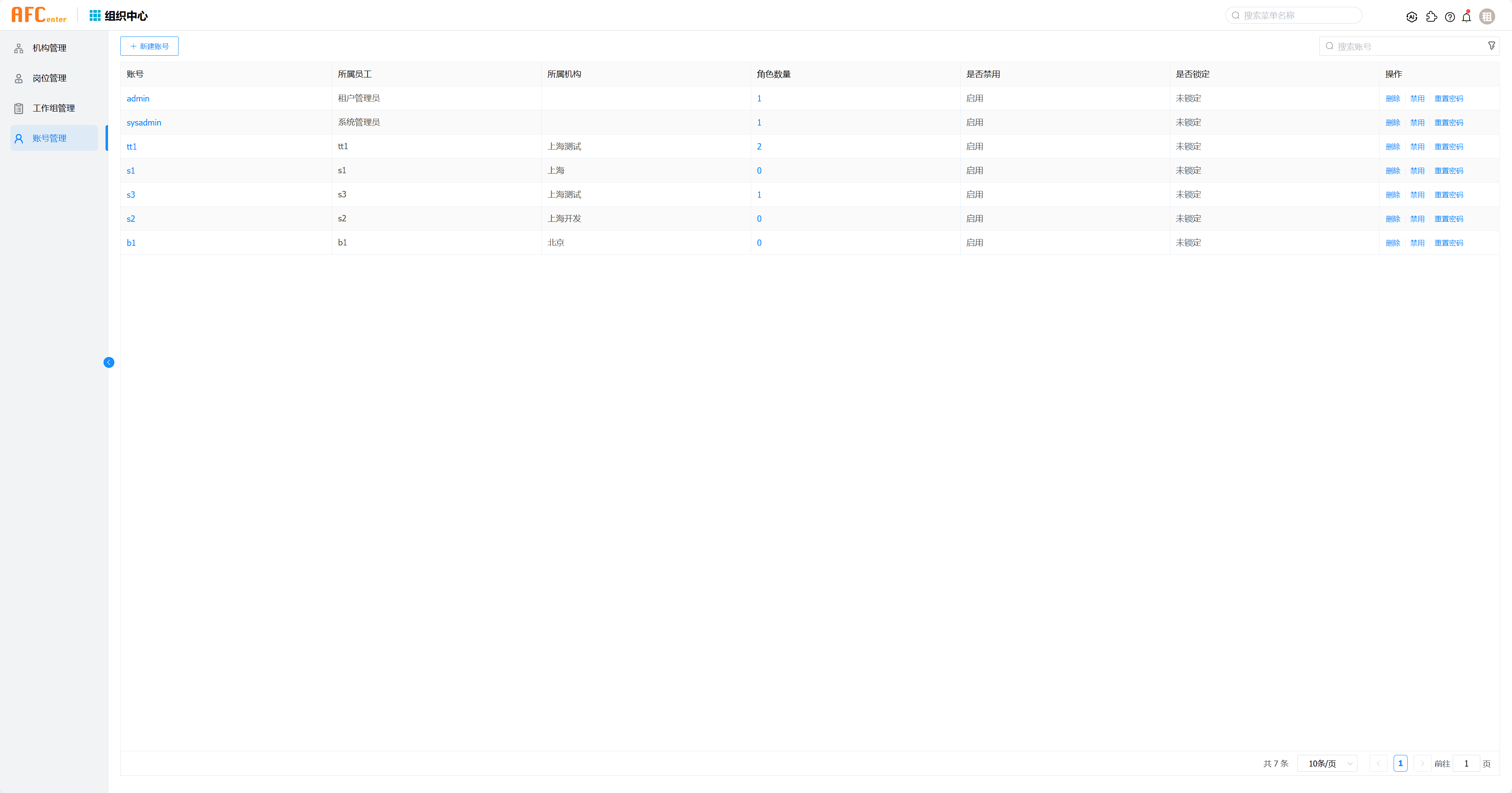 在左侧导航栏中单击账号管理,您可以在此页面搜索账号,删除、禁用账号,重置账号的密码。
