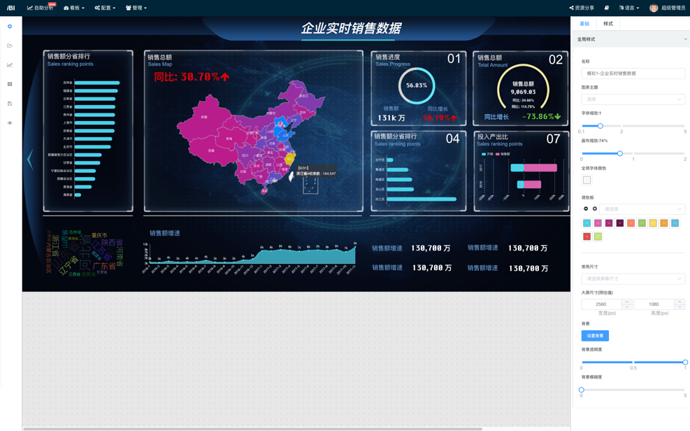 新的大屏设计器为了支持用户在小屏幕上为高分辨率大屏设计看板,加入了屏幕分辨率预设、画布缩放、全局字体缩放,全局调色板等功能。 数据点击画布空白处显示全局样式