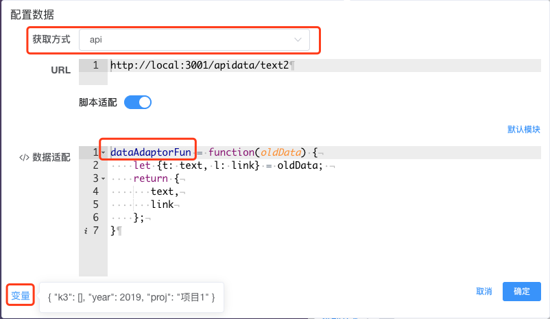 !> 如果请求返回数据结构和组件期望数据结构不一致, 可以使用脚本适配函数调整数据结构, dataAdaptorFun 为脚本适配函数别名
