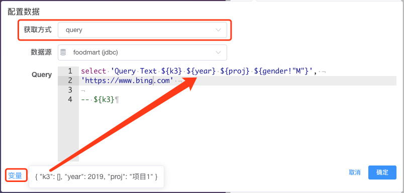 • Query 方式: 用户可以直接对数据源进行查询, 查询脚本中可以使用环境变量动态生成不同条件, 不同结构的查询语句, 变量使用规范与数据集变量语法一致, 查询返回结果集之后, 不同组件根据约定列名获取数据, 如果约定列名不存在则按列顺序匹配数据
