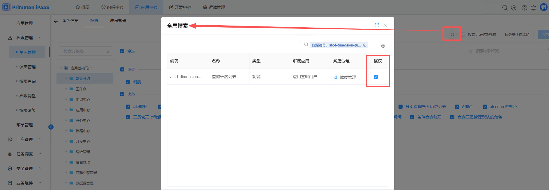 afc-f-dimension-query是组织维度查询相关的权限代码。新建角色默认不包含任何权限,需要手动为角色授权才能访问相应的功能模块。