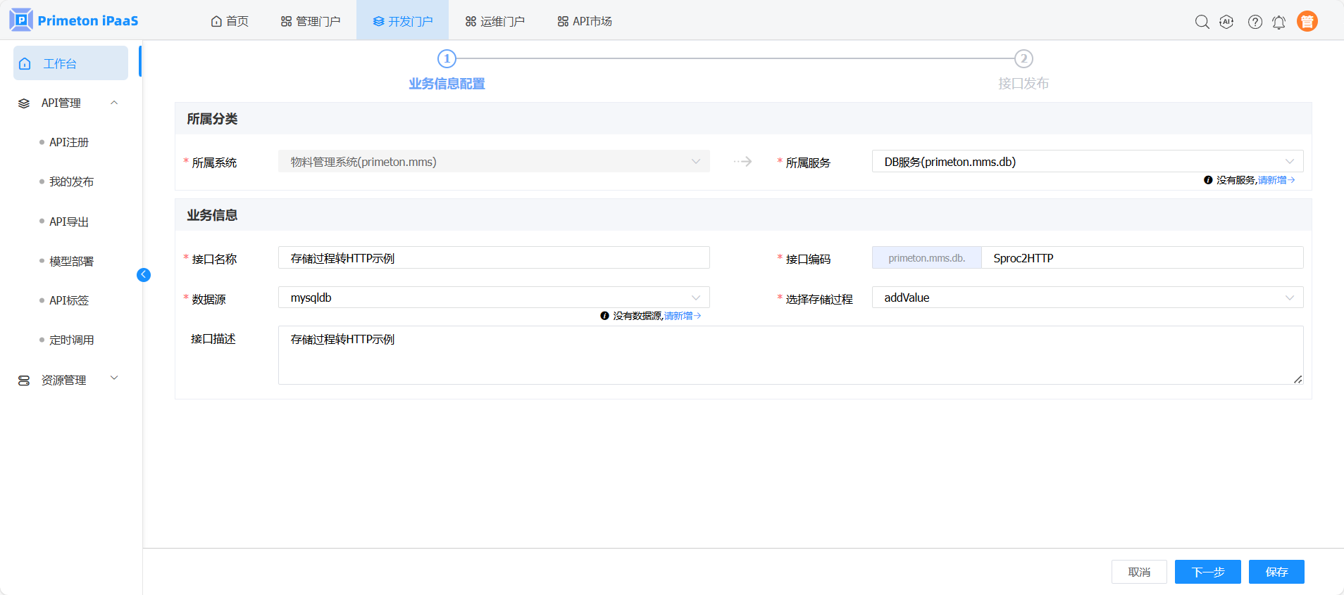 参数 说明 所属系统 数据源所属系统 数据源编码 数据源编码 数据源名称 数据源名称 数据库类型 数据库类型,可选MySql、Oracle、PostgreSQL、SQLServer、DM、openGaussDB、GBase8a、HighGoDB、KingbaseES、UXDB、Oscar、GBase8s 驱动程序 驱动程序驱动 数据库账号 数据库账号 数据库密码 数据库密码 数据库IP 数据库服务器IP 数据库端口 数据库端口 数据库名称 数据库名称 Schema 数据库Schema 数据库URL 数据库URL 连接池最大值 接池最大值 连接池最小值 连接池最小值 查询超时(s) 数据库查询超时时间,的那位秒 读取超时(ms) 数据库读取超时,单位毫秒 测试SQL语句 连接连通性测试SQL语句 “业务信息配置”信息填写完成后,点击“下一步”按钮,进入“接口发布”页面,在接口发布页面填写相关参数,点击“发布”按钮,即可完成对存储过程的发布操作。