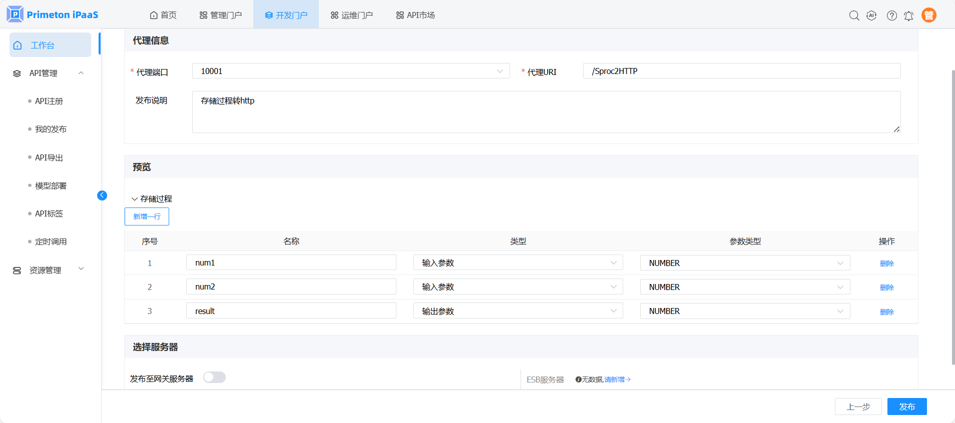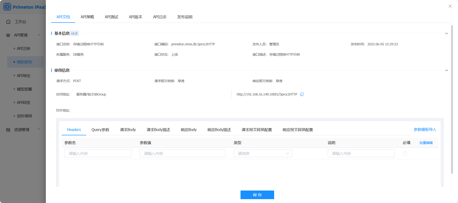 参数 说明 代理端口 接口发布的代理端口号 代理URI 接口发布后的代理URI 发布说明 发布说明 存储过程 存储过程输入、输出参数 选择服务器 接口发布的服务器 进入开发门户,点击菜单“API管理”>"我的发布",进入“我的发布”页面,选择左侧组织树中本章节新增API的所属系统,在右侧界面可查看本章节创建的存储过程转HTTP接口的发布记录。