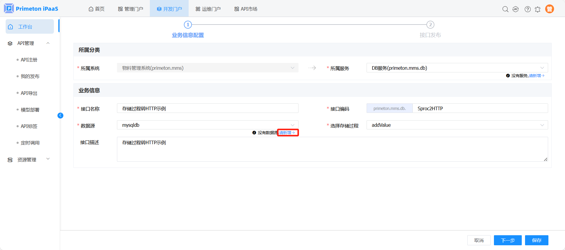 参数 说明 所属系统 API所属系统 所属服务 API所属服务,若没有对应服务,点击服务下的新增创建服务 接口名称 API接口名称 接口编码 API接口编码 数据源 需要发布的数据源,若没有对应数据源,请参考 步骤5 新增数据源 选择存储过程 数据库中需要发布的存储过程 接口描述 业务接口描述 若没有数据源,请点击“数据源”字段右下角“请新增”按钮,弹出“新增数据源”弹框。