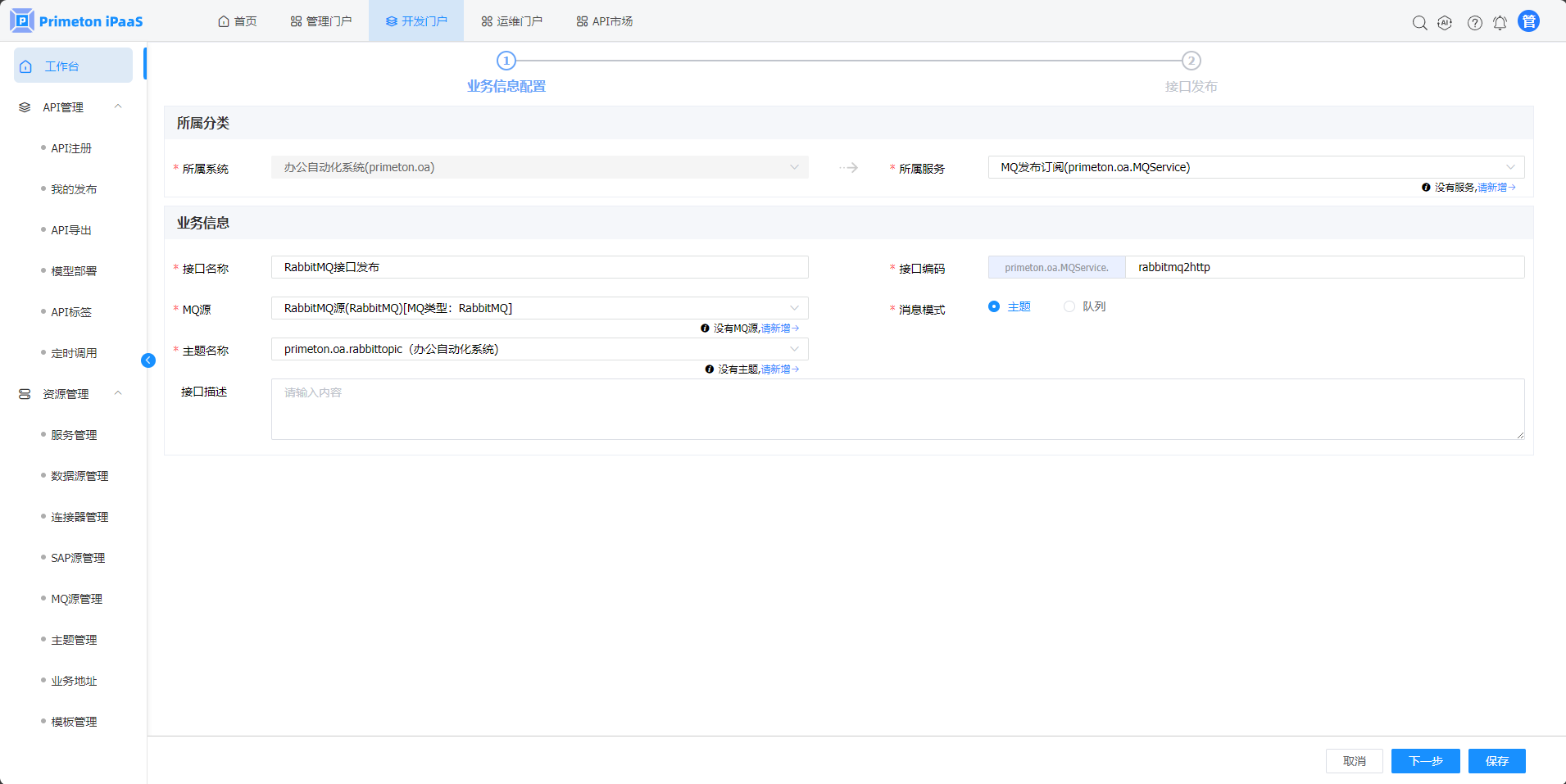 3.“API快速发布“弹窗,选择”MQ“页签,点击"RabbitMQ”转HTTP“按钮,进入”RabbitMQ转HTTP“接口发布页面。