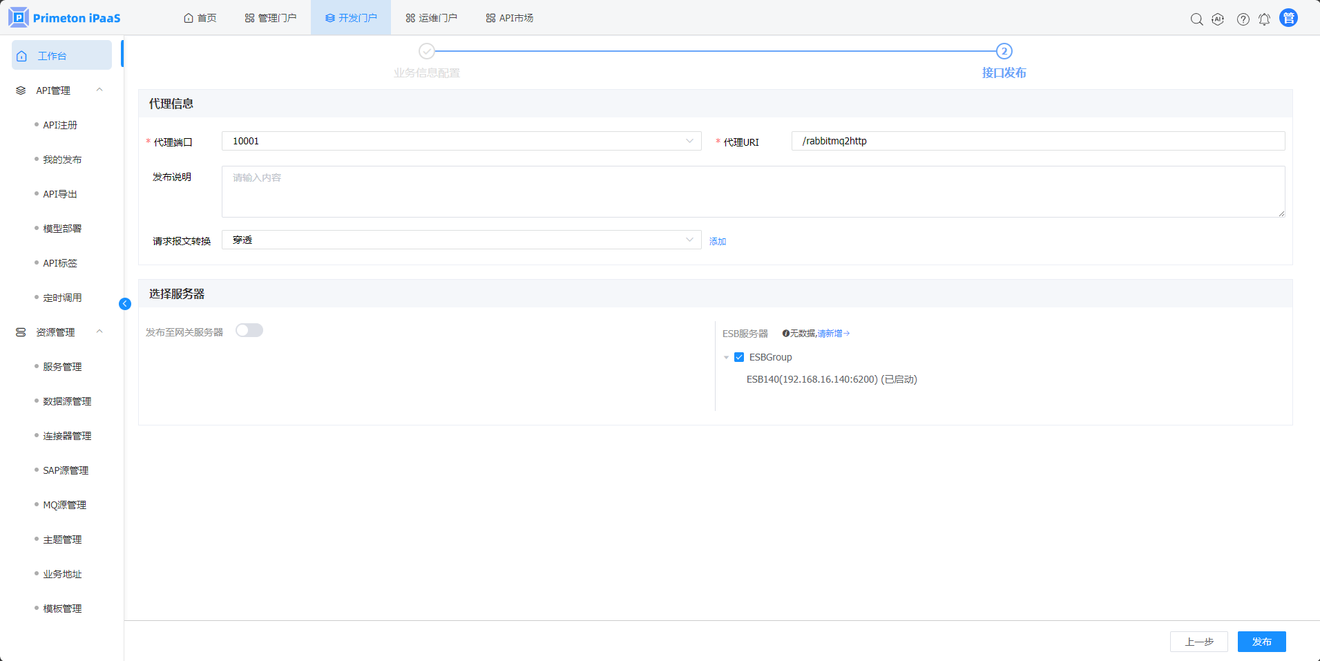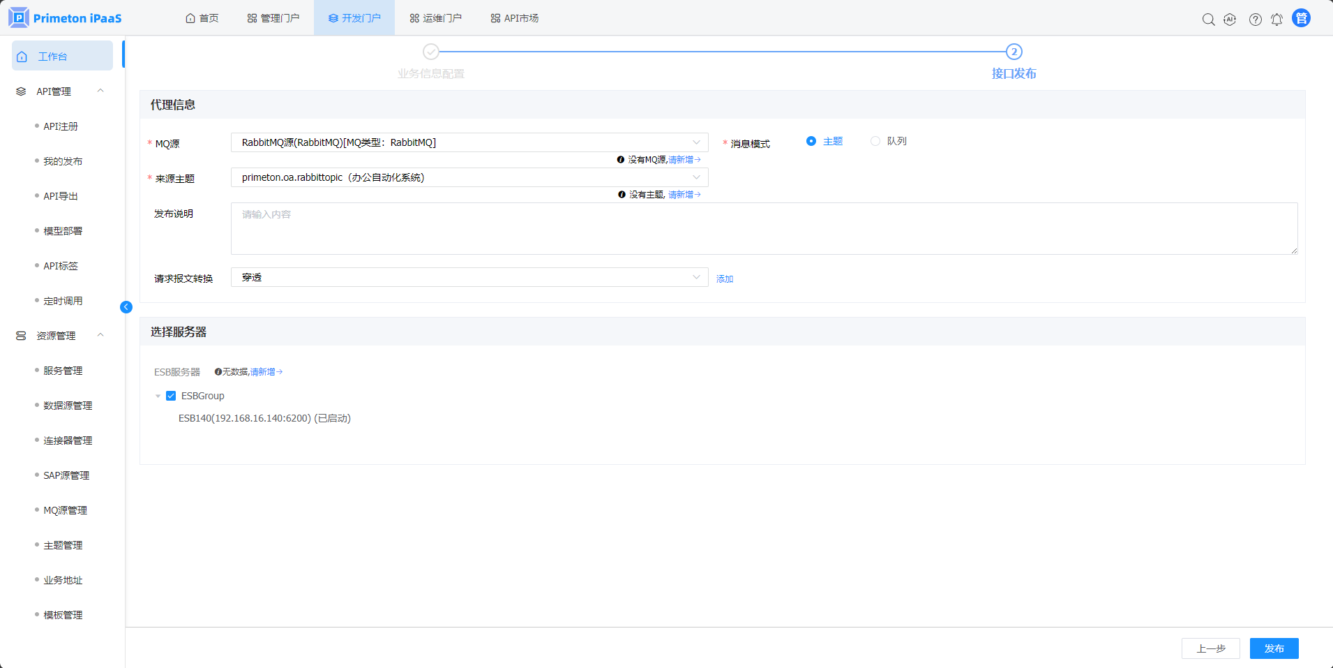 3.“API快速发布“弹窗,选择”MQ“页签,点击”HTTP转RabbitMQ“按钮,进入”HTTP转RabbitMQ“接口发布页面。