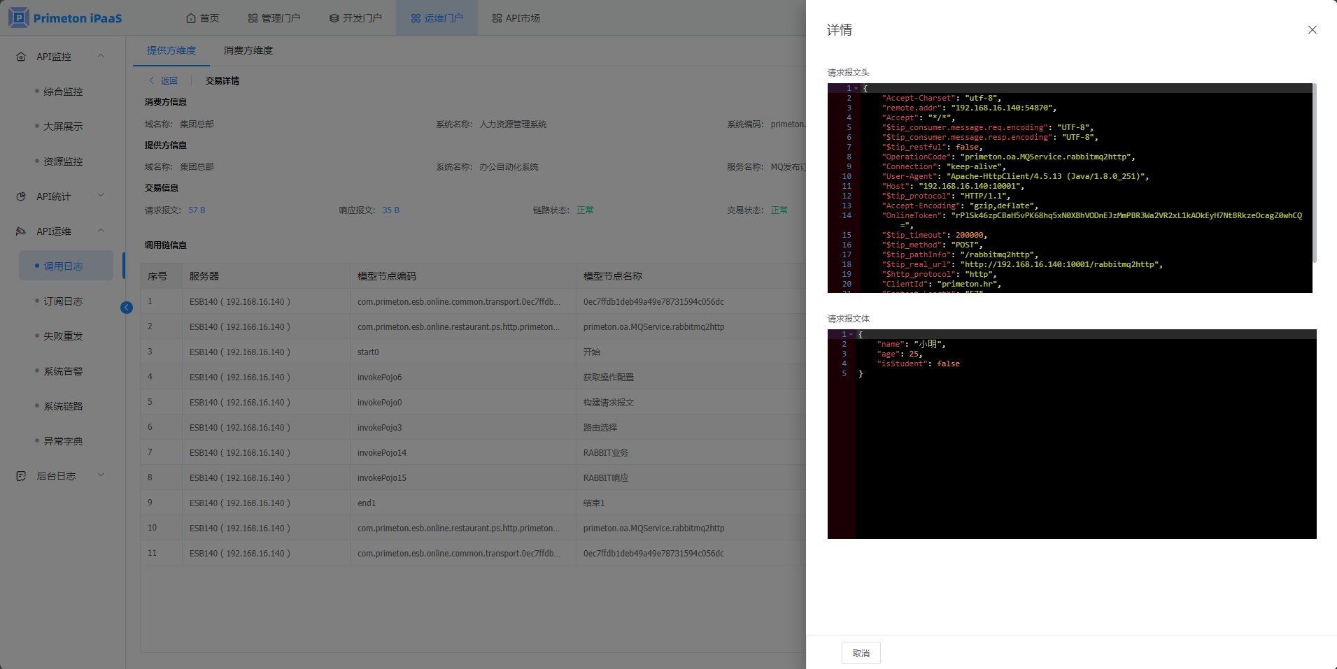 1. 点击菜单“API运维”>"调用日志",进入“调用日志”页面。