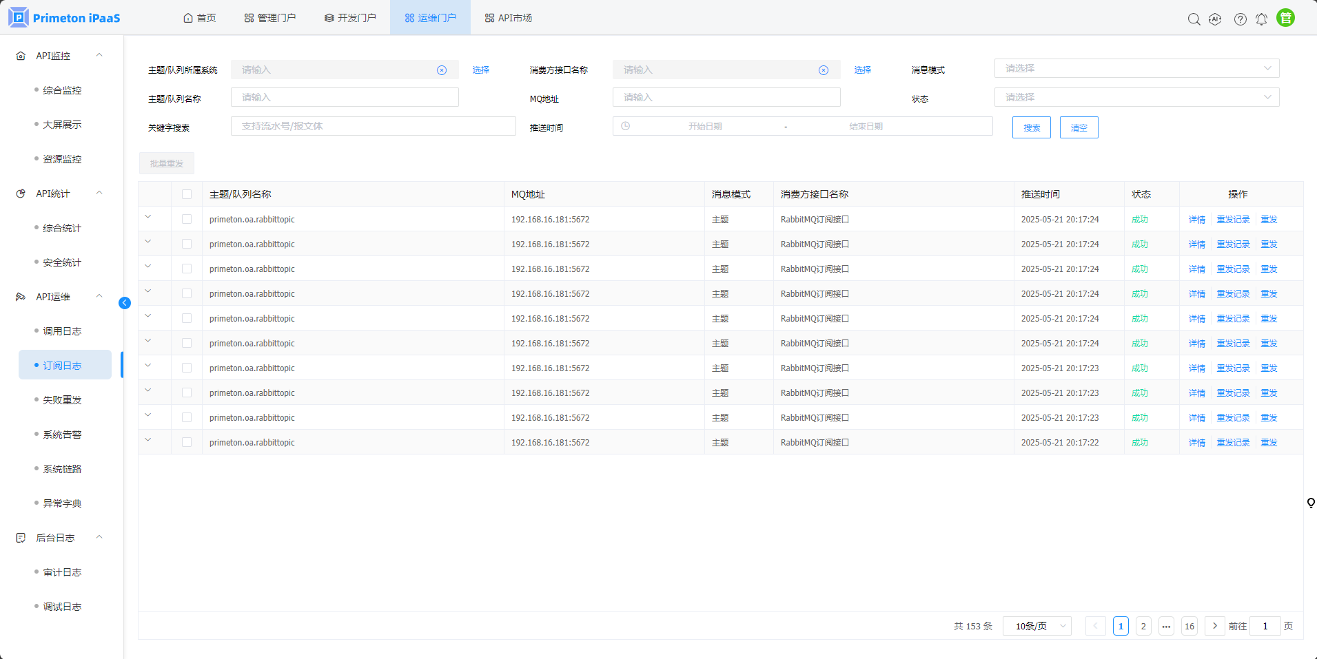 1. 点击菜单“API运维”>"订阅日志",进入“订阅日志”页面。