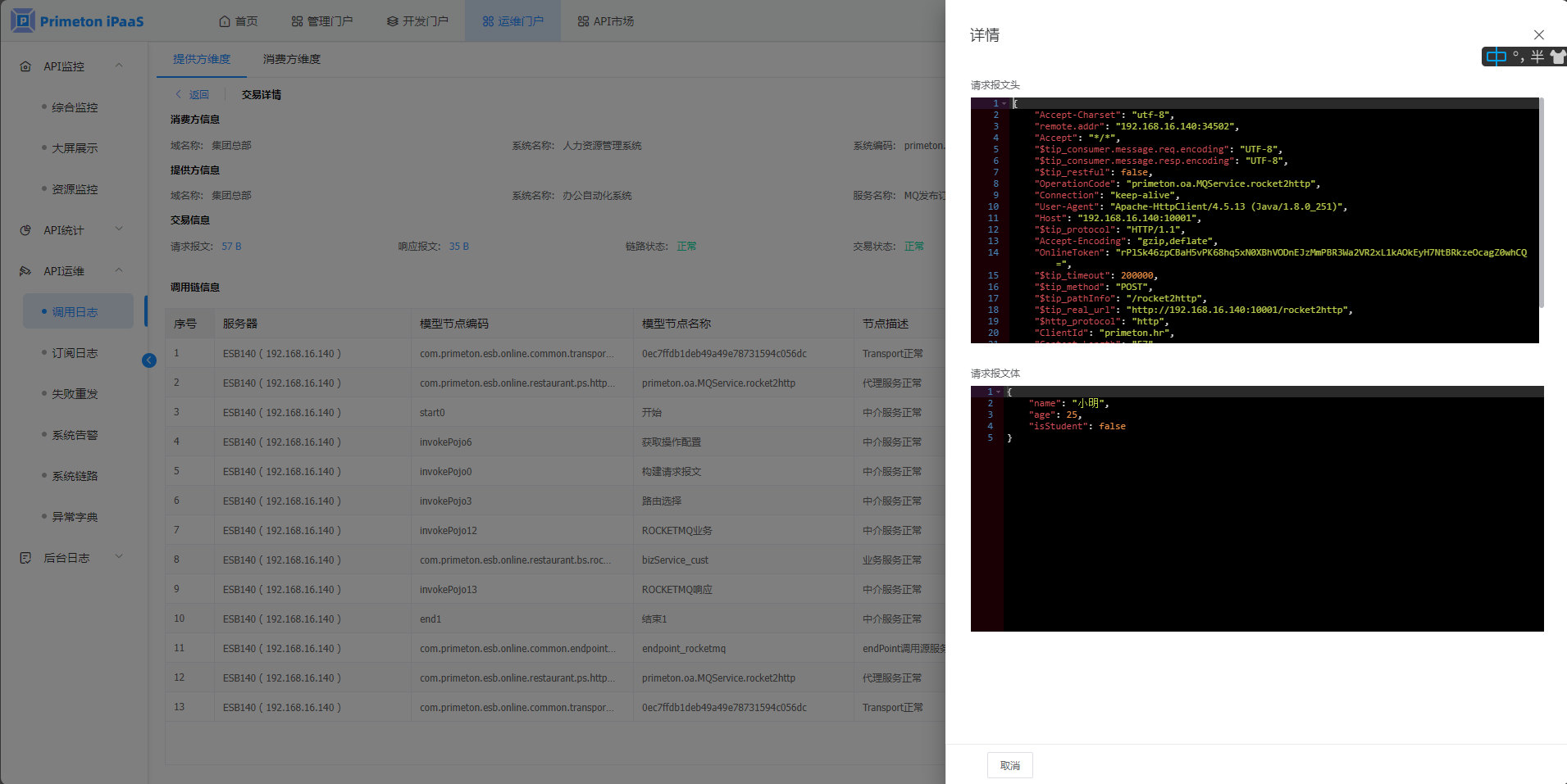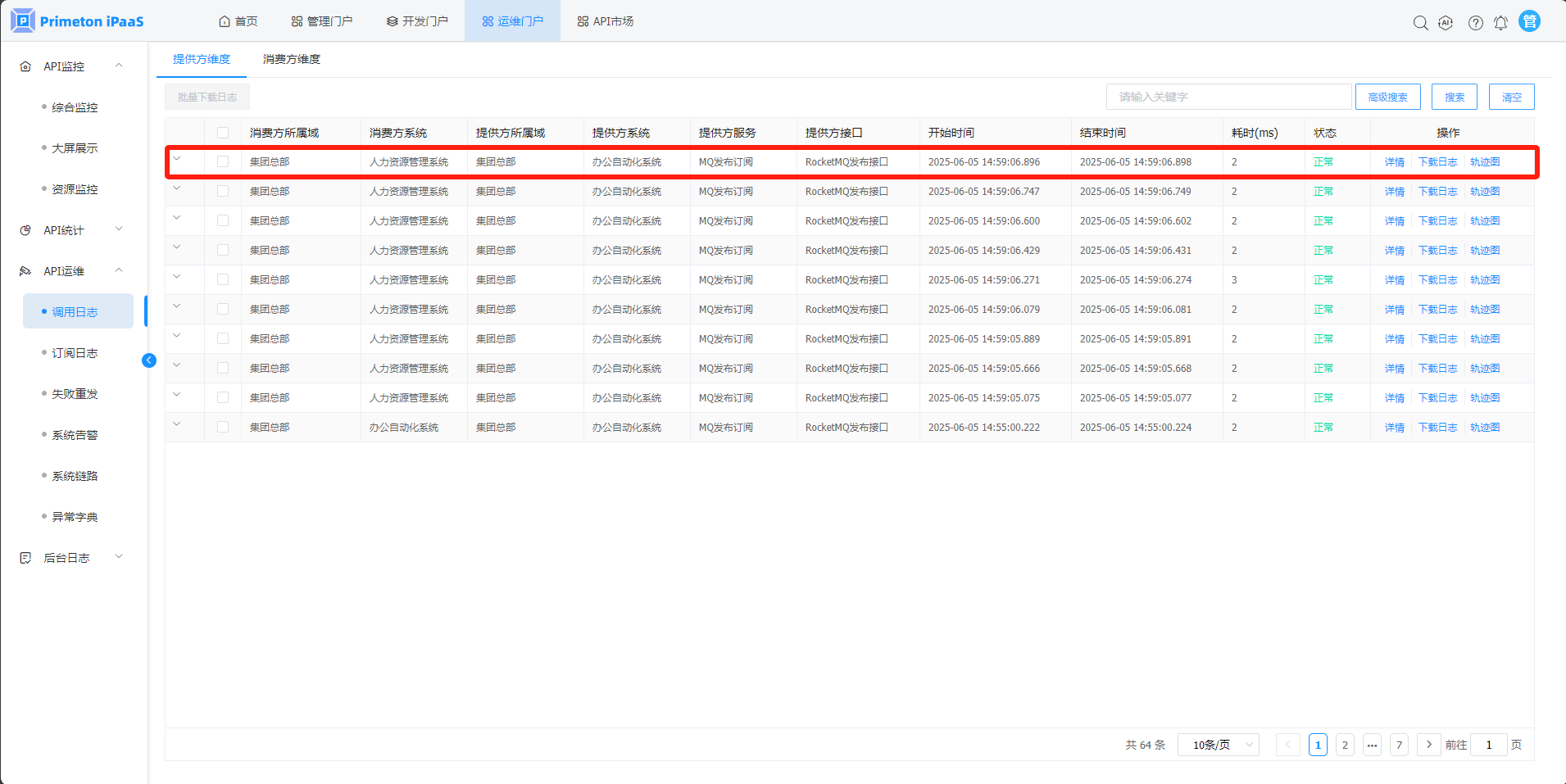 点击菜单“API运维”>"调用日志",进入“调用日志”页面。