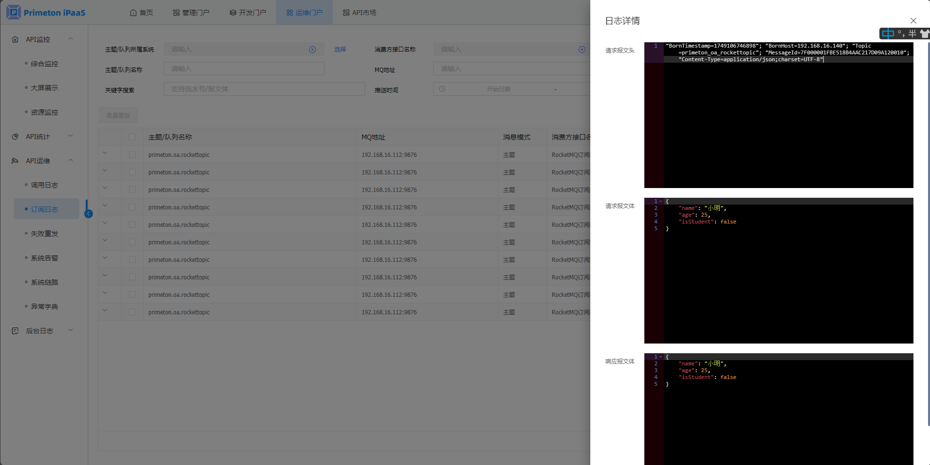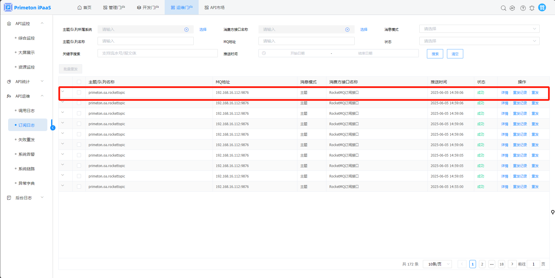 点击菜单“API运维”>"订阅日志",进入“订阅日志”页面。