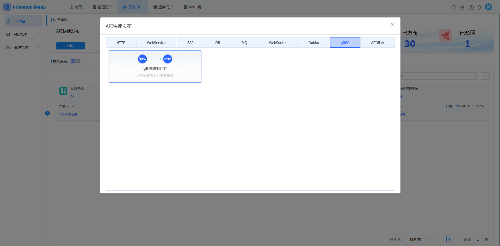2.“工作台”页面,在“我的系统”页签中,点击系统卡片上的“API快速发布“按钮,弹出“API快速发布“弹窗。