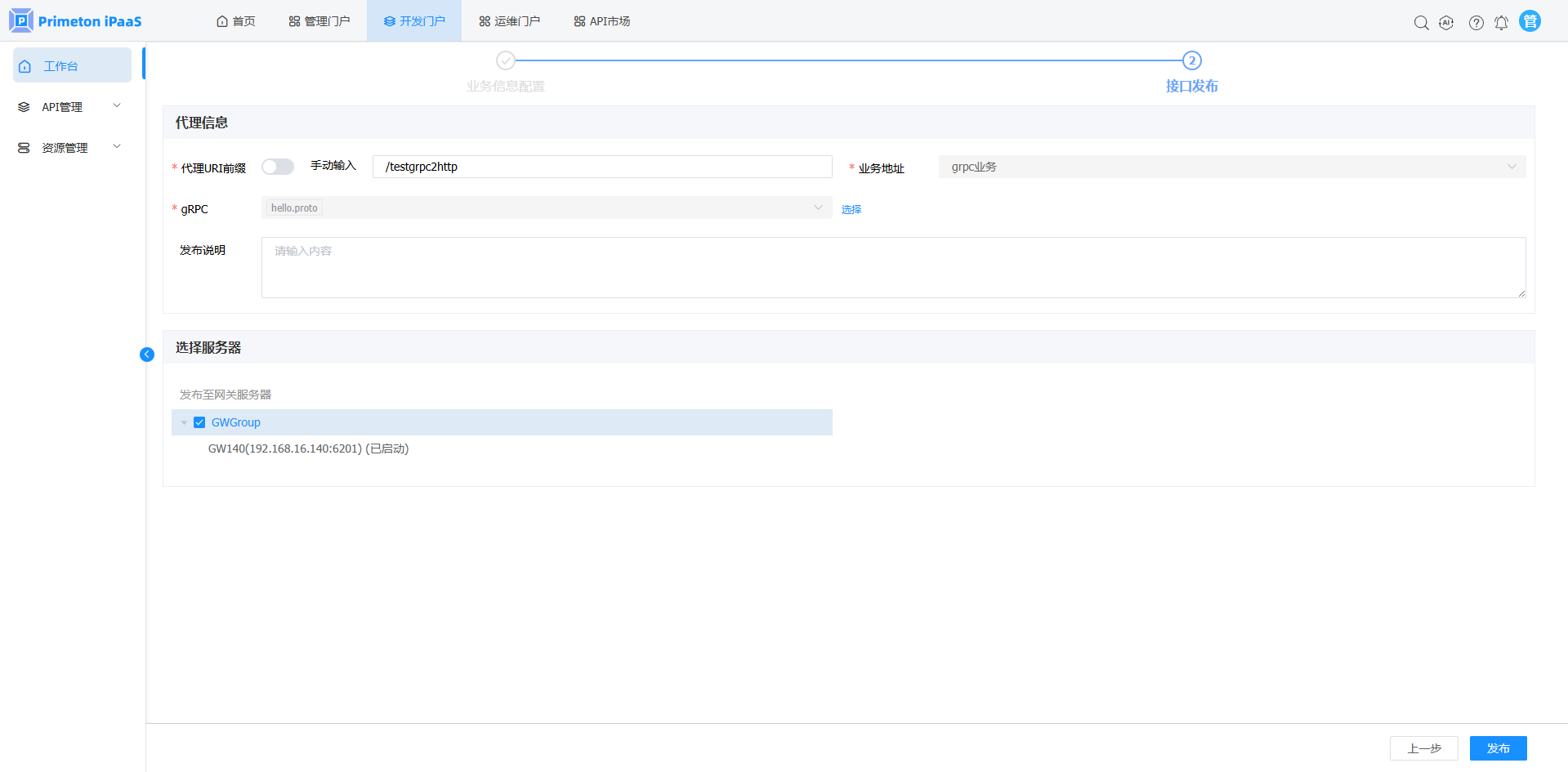 3.“API快速发布“弹窗,选择”gRPC“页签,点击”gRPC转HTTP“按钮,进入”gPRC转HTTP“接口发布页面。