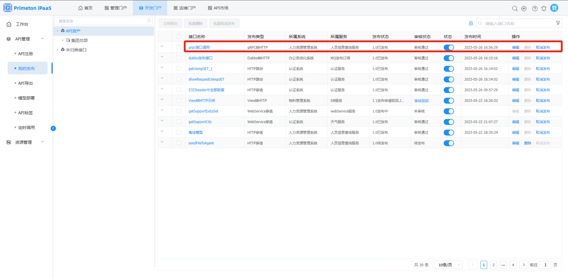 1.在"API管理">"我的发布"页面,可查看刚创建接口的发布记录。