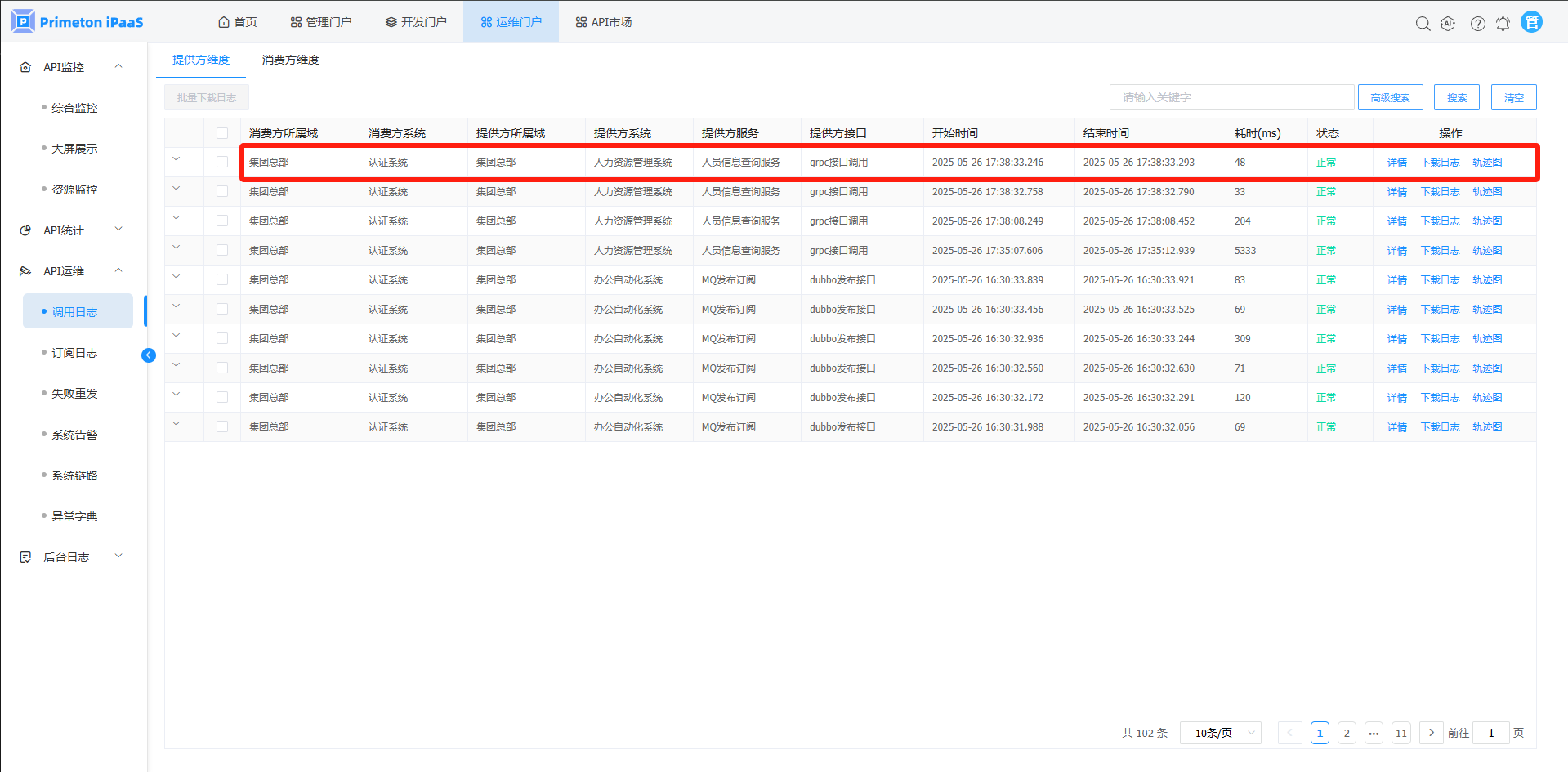 点击菜单“API运维”>"调用日志",进入“调用日志”页面。