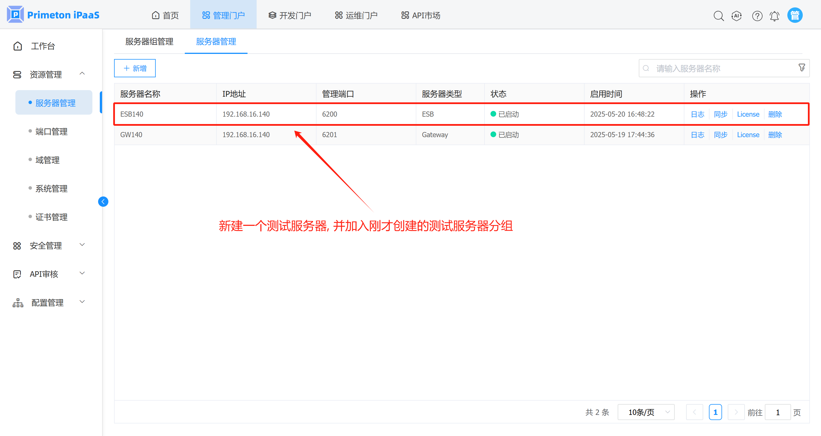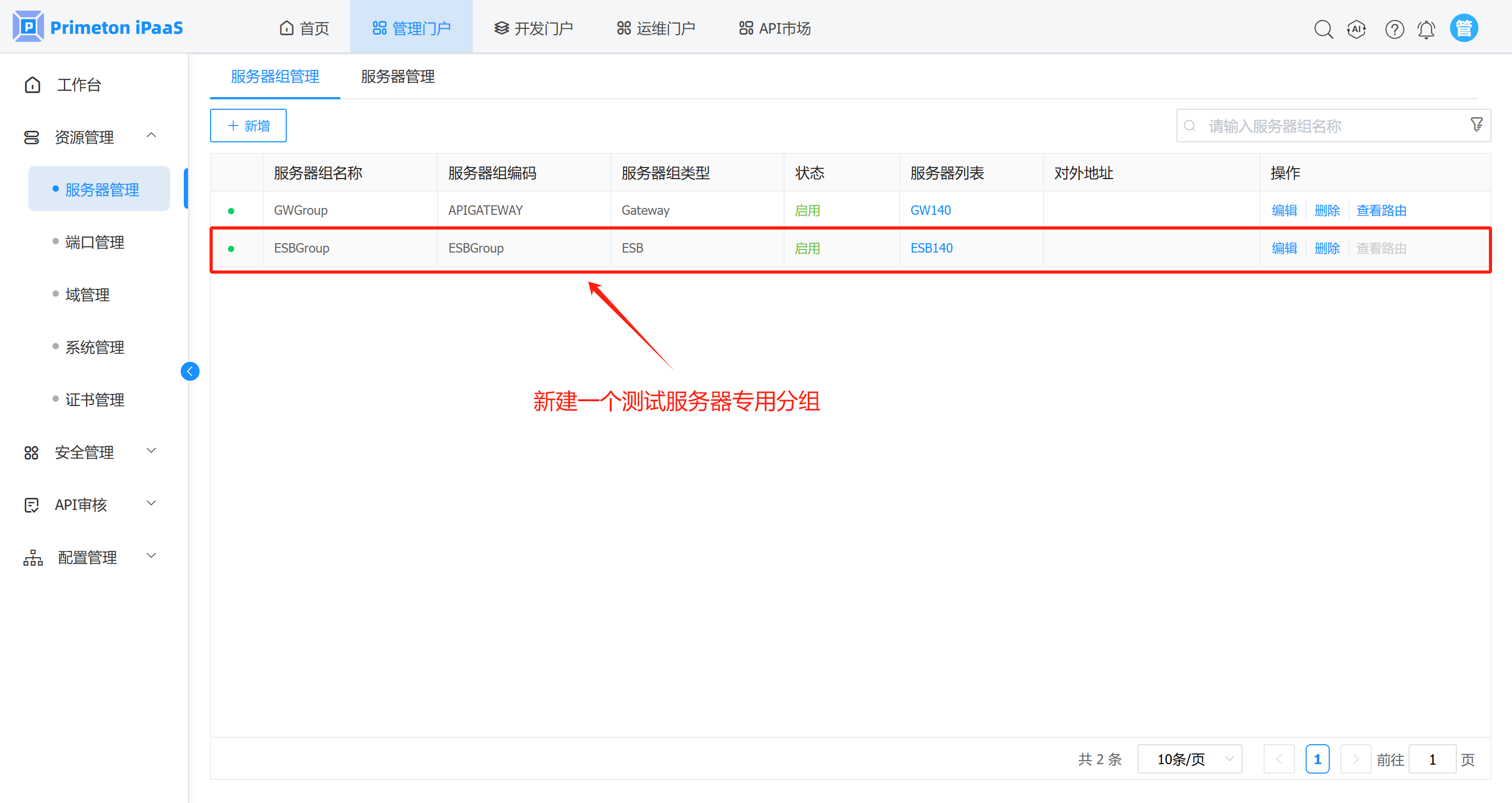 登录后在【管理门户】/【服务器管理】页面中,新增测试服务器分组,然后新增一个测试服务器并添加到测试分组。如下图: