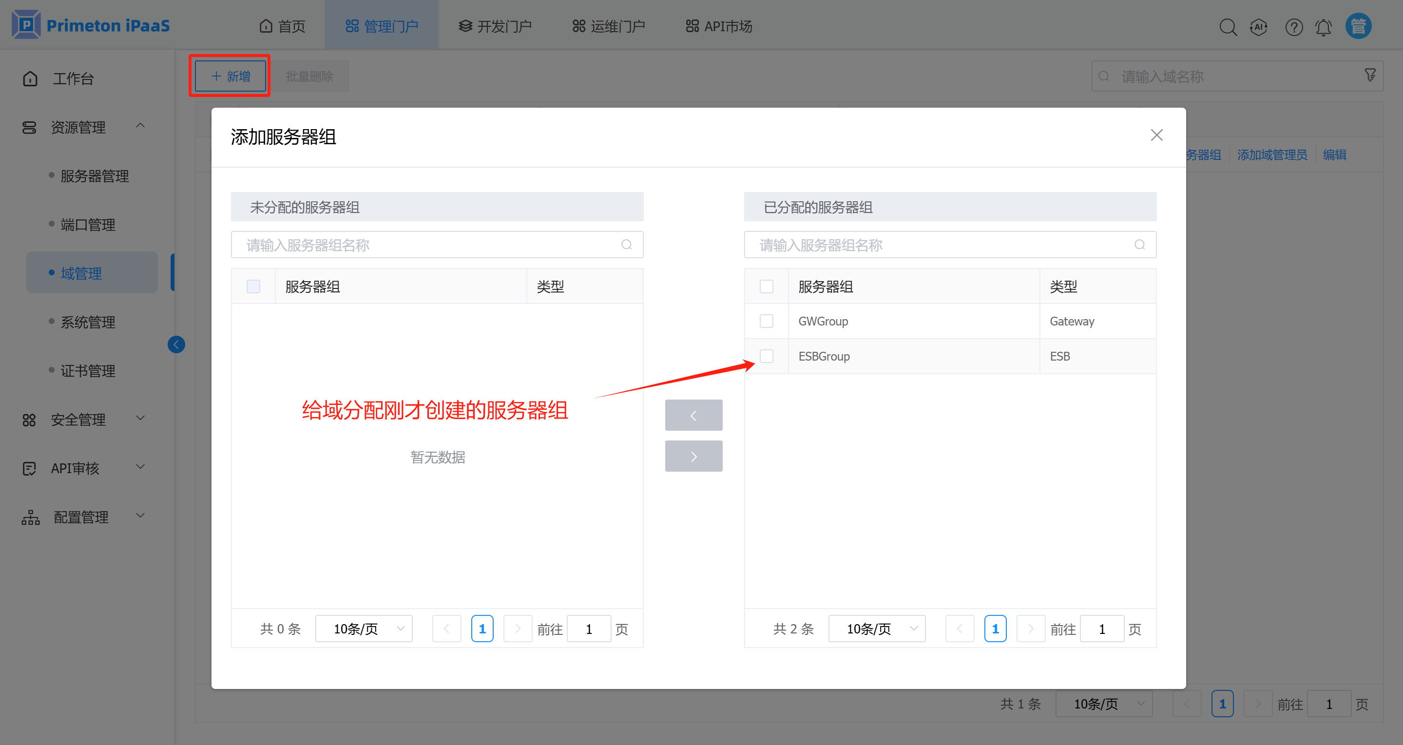 在【域管理】页面中点击【添加服务器组】,给域分配将刚才创建的服务器组。如下图: