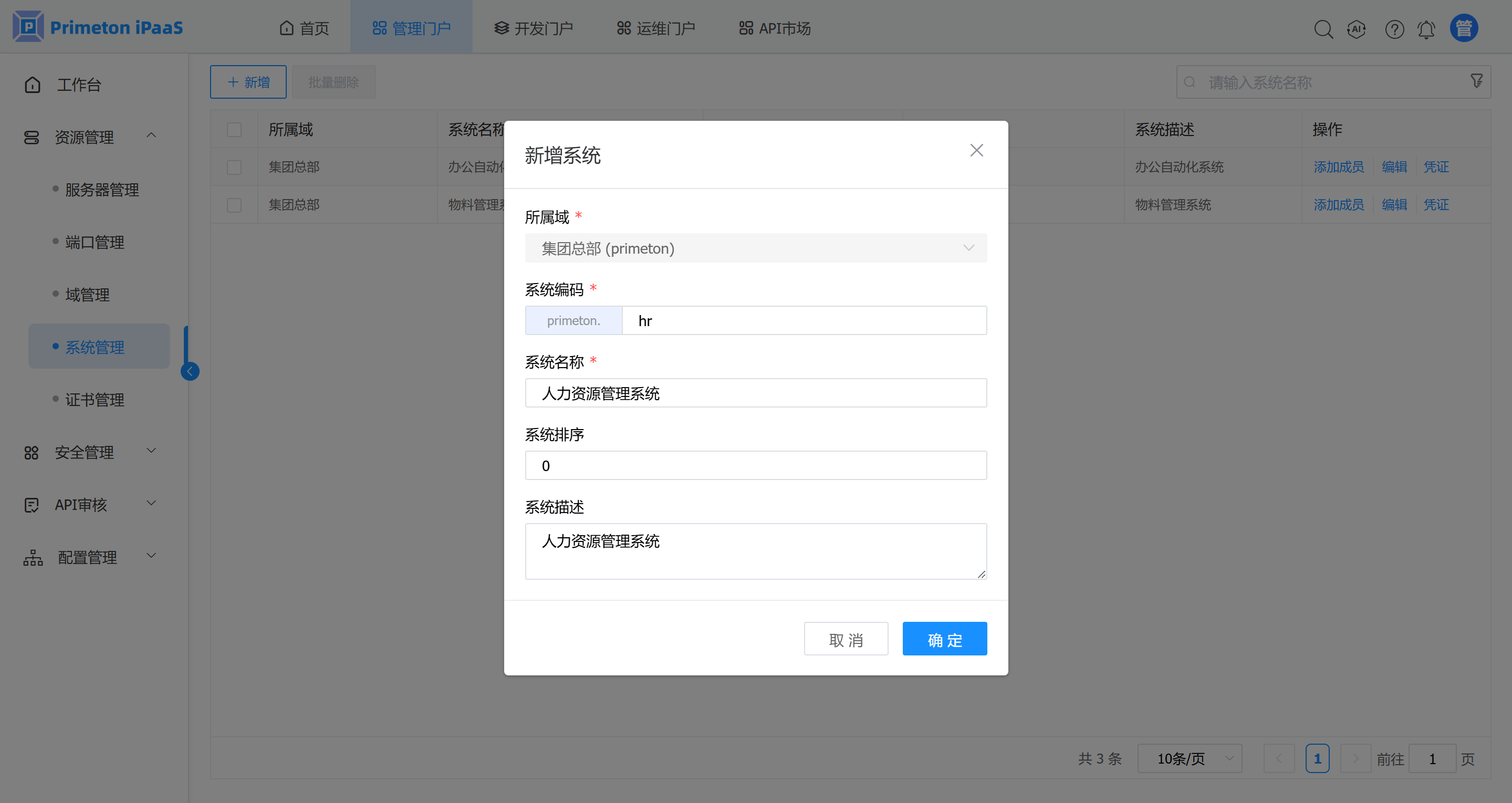在【系统管理】页面中点击【新增】按钮,新增一个系统。如下图: