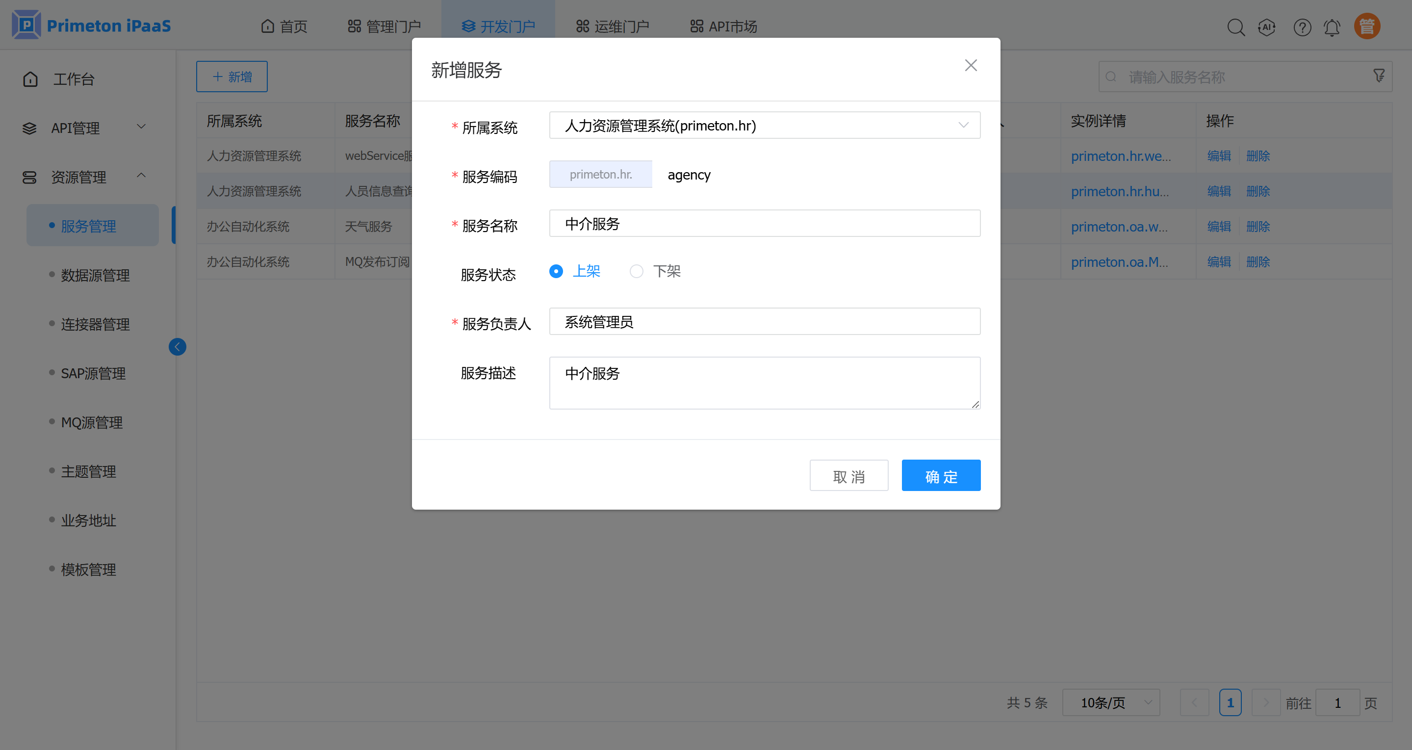 登录后在【开发门户】/【资源管理】/【服务管理】页面中,新增一个中介服务。如下图: