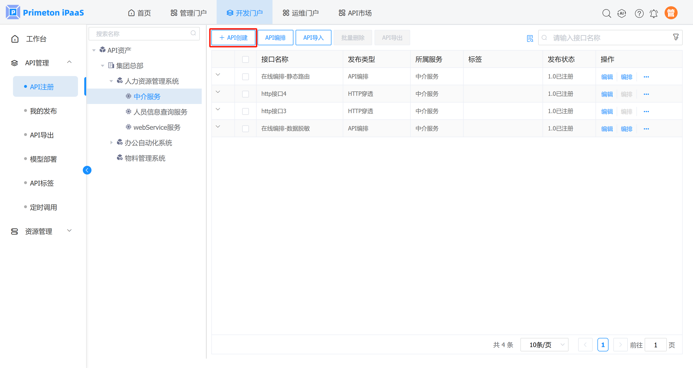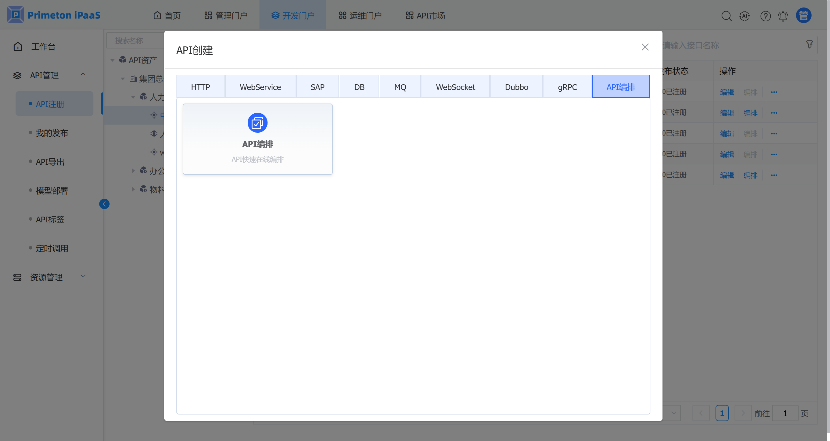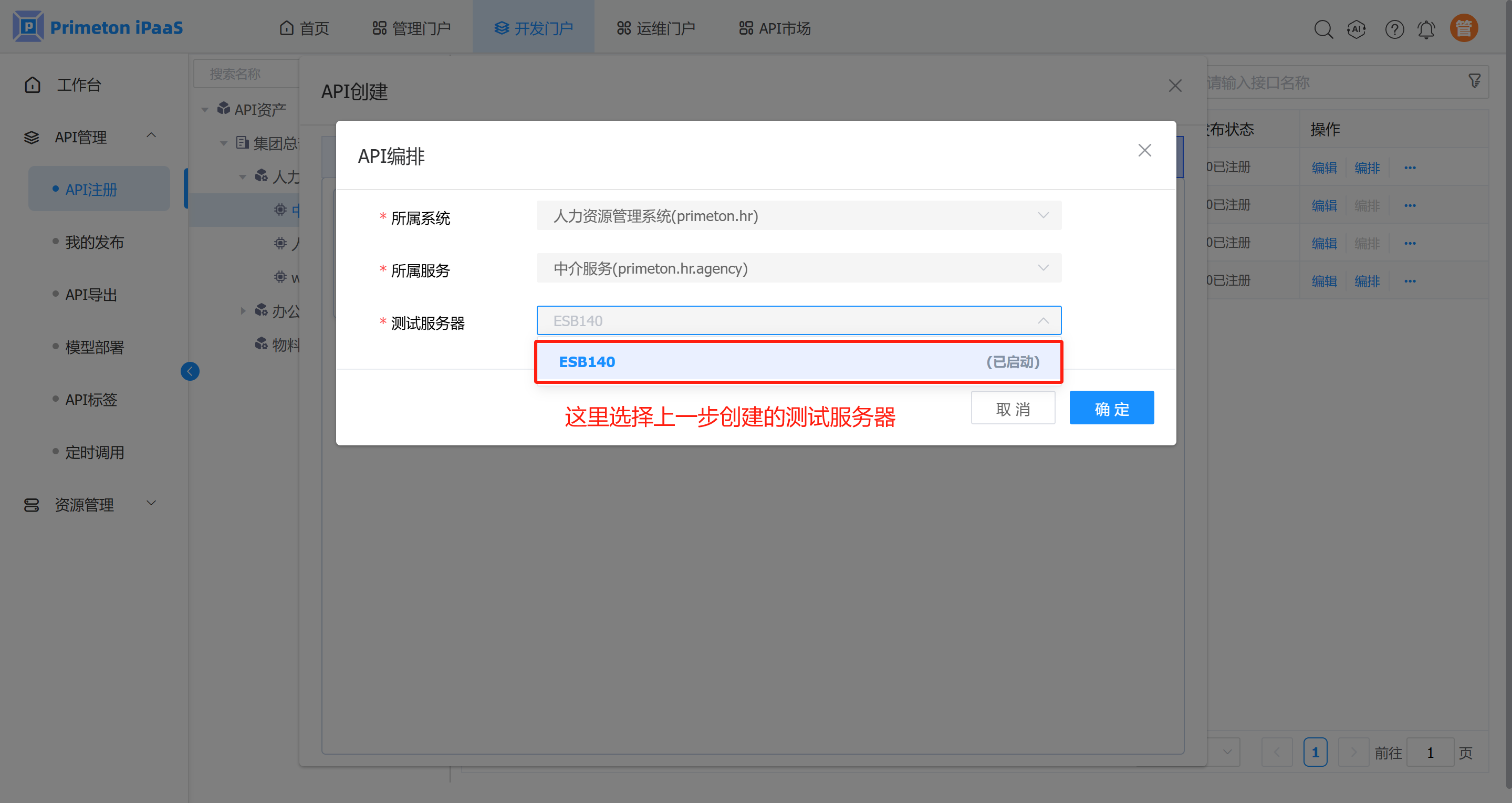 登录后在【API管理】/【API注册】页面中,选中目标系统并点API创建,新增API编排。然后选择新增的中介服务,并选中上一步创建的测试服务器,然后点击确定保存。如下图: