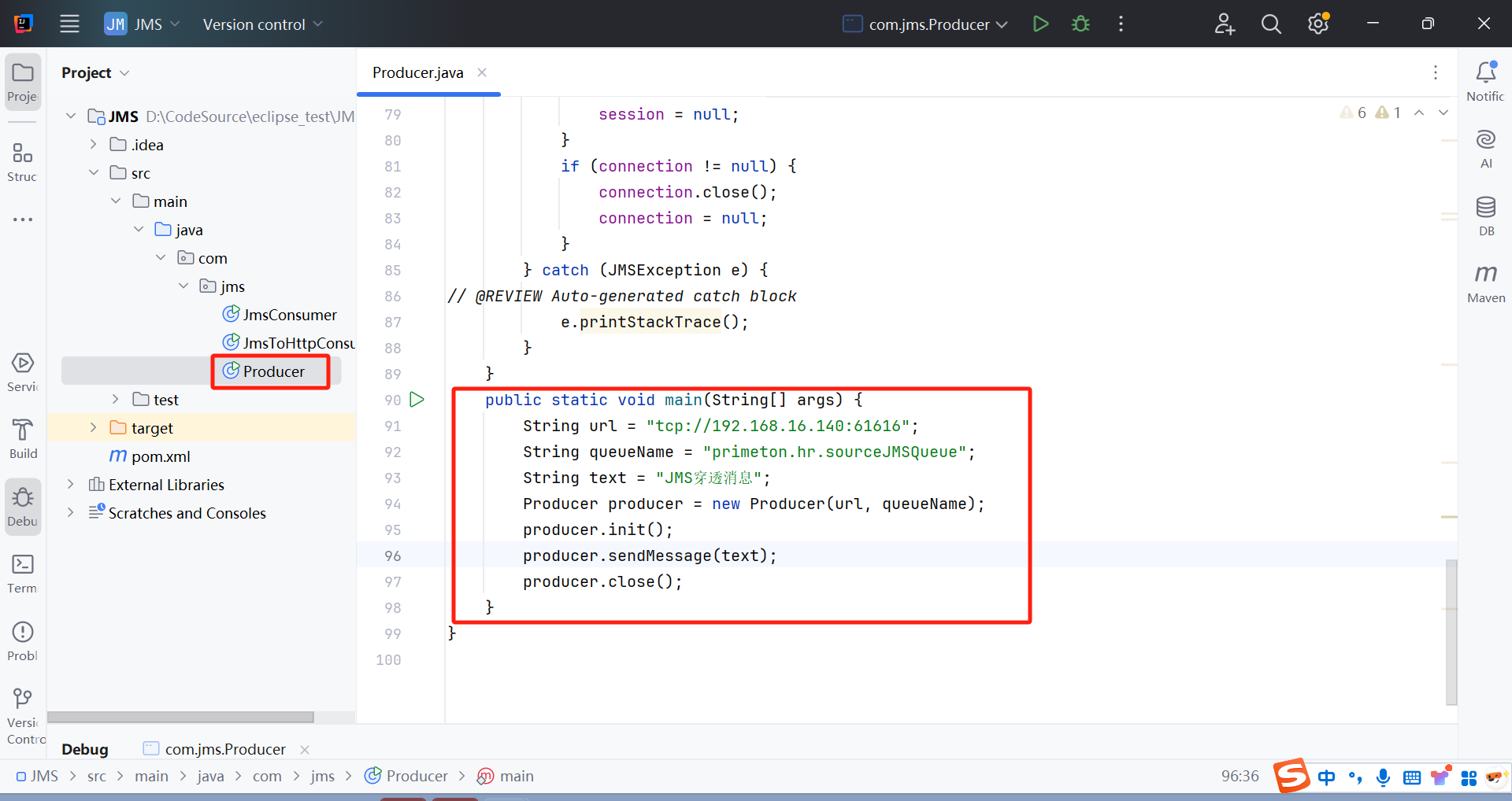 修改Producer类(类路径:com.jms.Producer)Main方法中的属性。