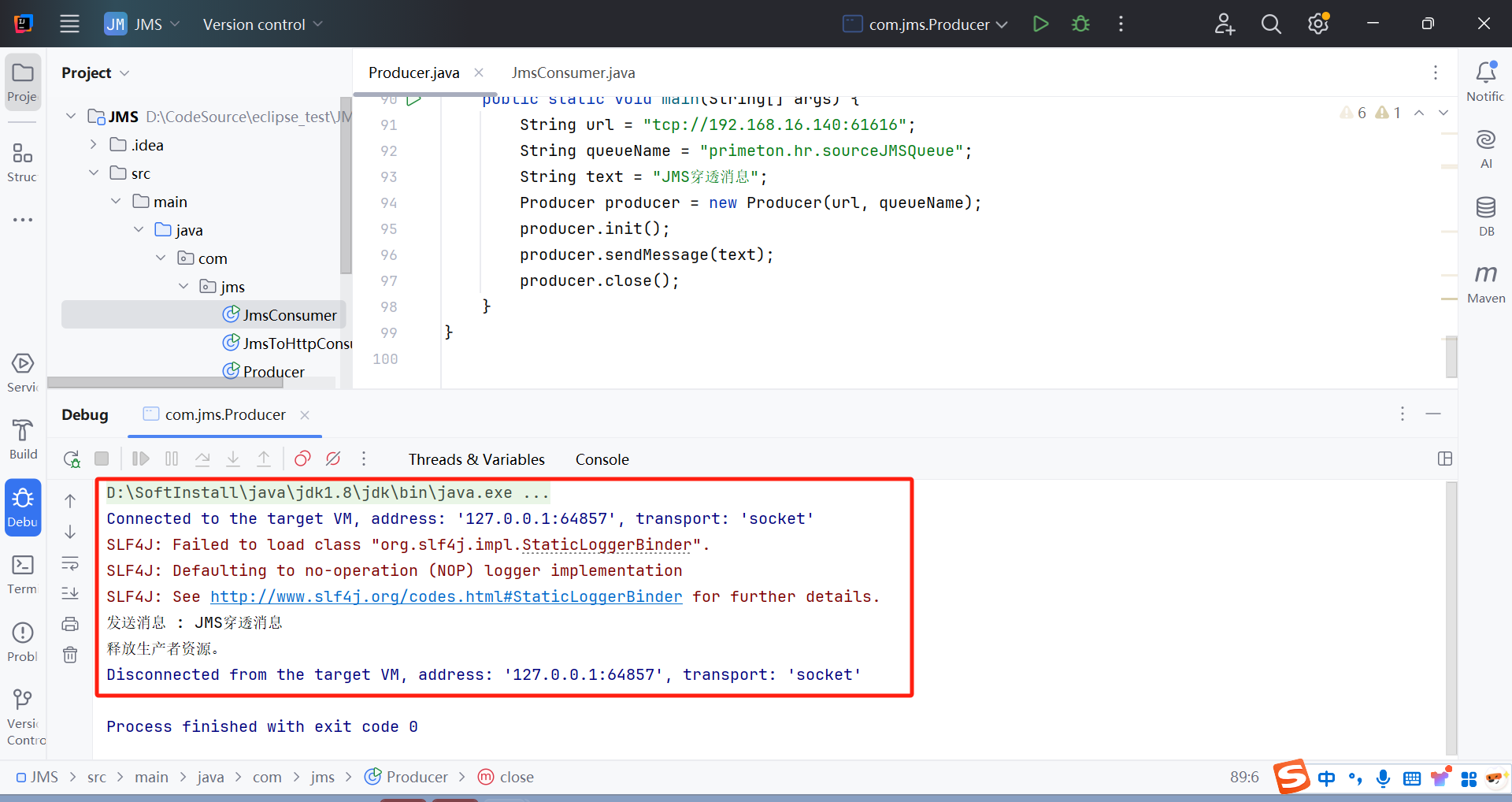 请下载 JMS.zip java工程,调用中介JMS穿透接口。下载后使用开发工具打开(此例子中使用idea开发工具)。