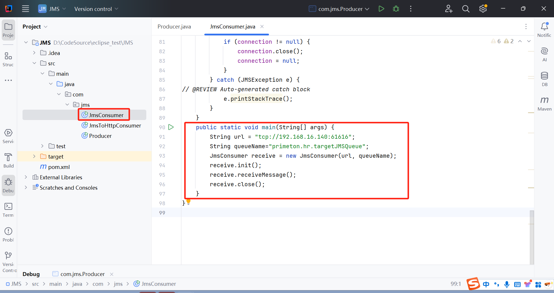 修改JmsConsumer类(类路径:com.jms.JmsConsumer)Main方法中的属性。