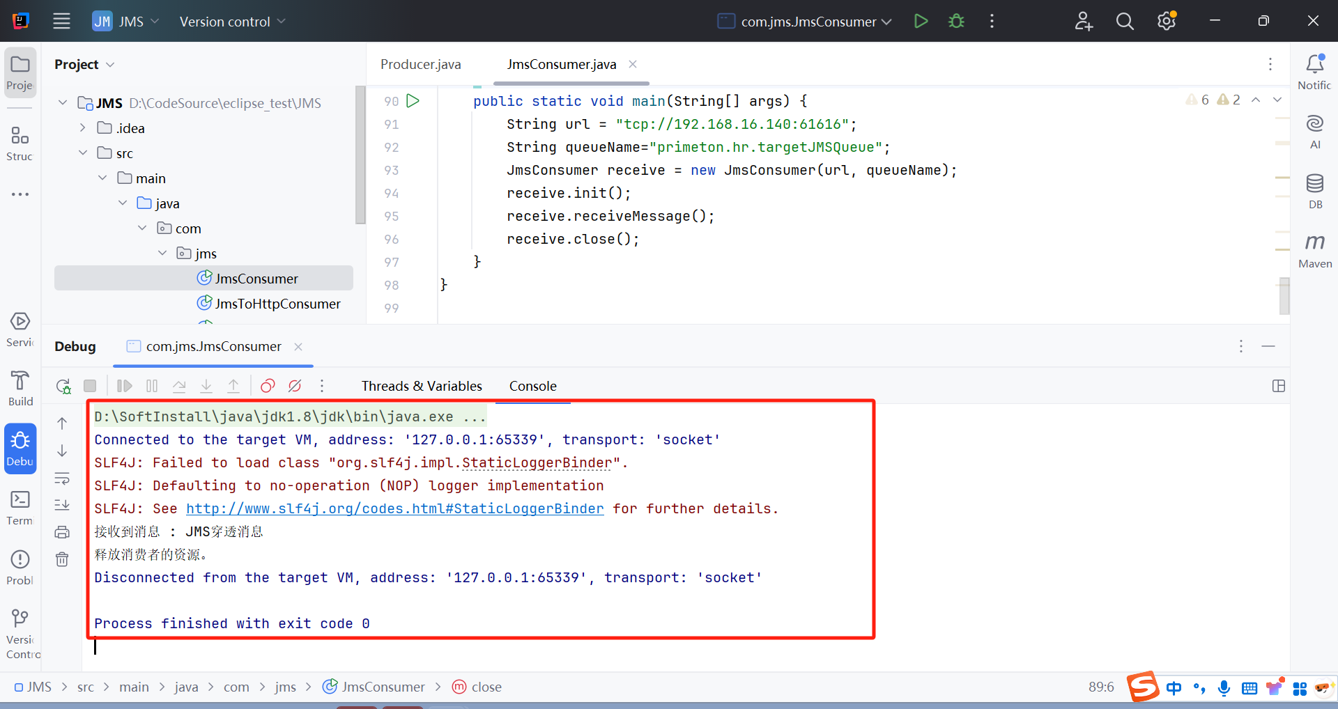参数 说明 url mq的访问地址,ip和端口为ESBServer的IP及MQ端口 queueName 使用的消息队列名称,请在编排的”JMS业务服务“图元中“队列名称”查看,此场景为“primeton.hr.targetJMSQueue” 执行Main方法,消费消息,在控制台打印获取的消息。