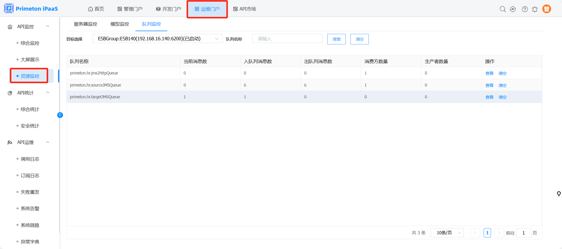 使用manager账号(默认密码:000000)登录系统,点击运维门户,进入“API监控”>“资源监控”页面,进入“队列监控”标签页,可查看ESB内置MQ队列信息。