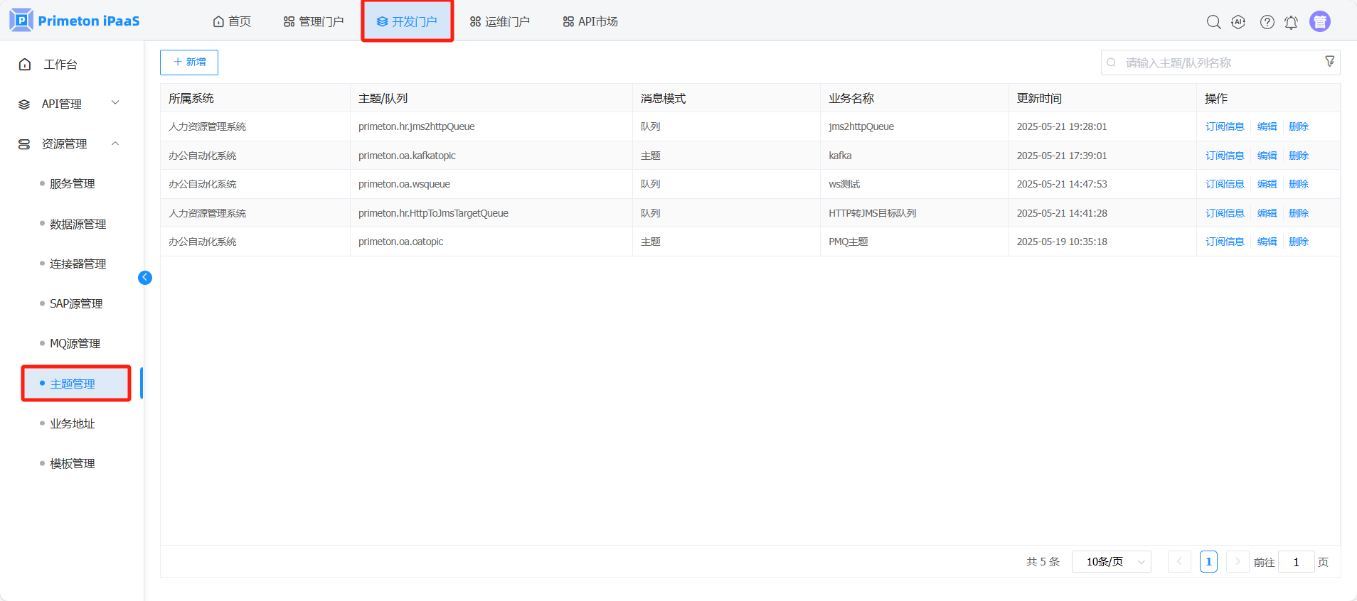 使用manager账号(默认密码:000000)登录系统,点击开发门户,进入“资源管理”>“主题管理”页面。